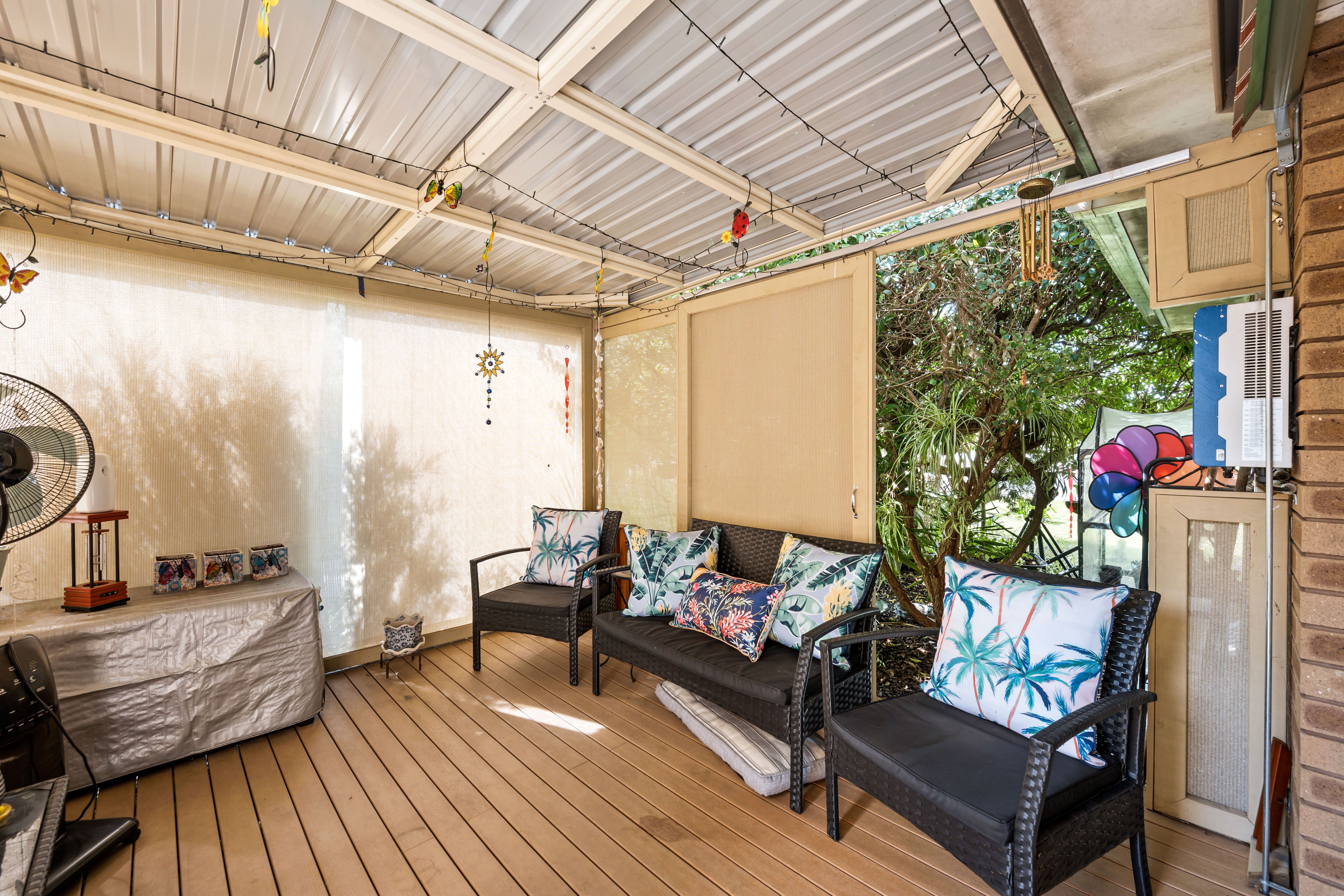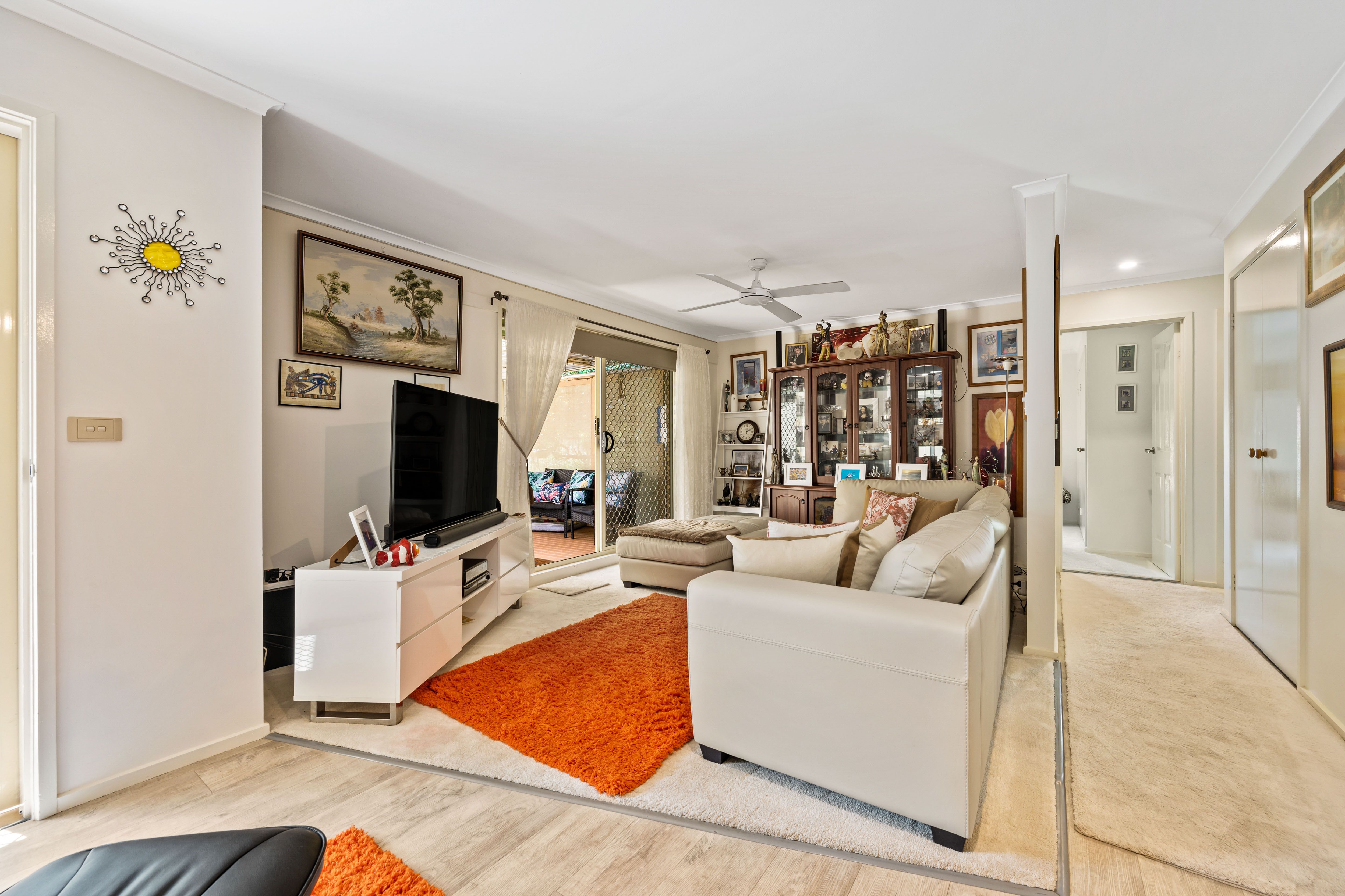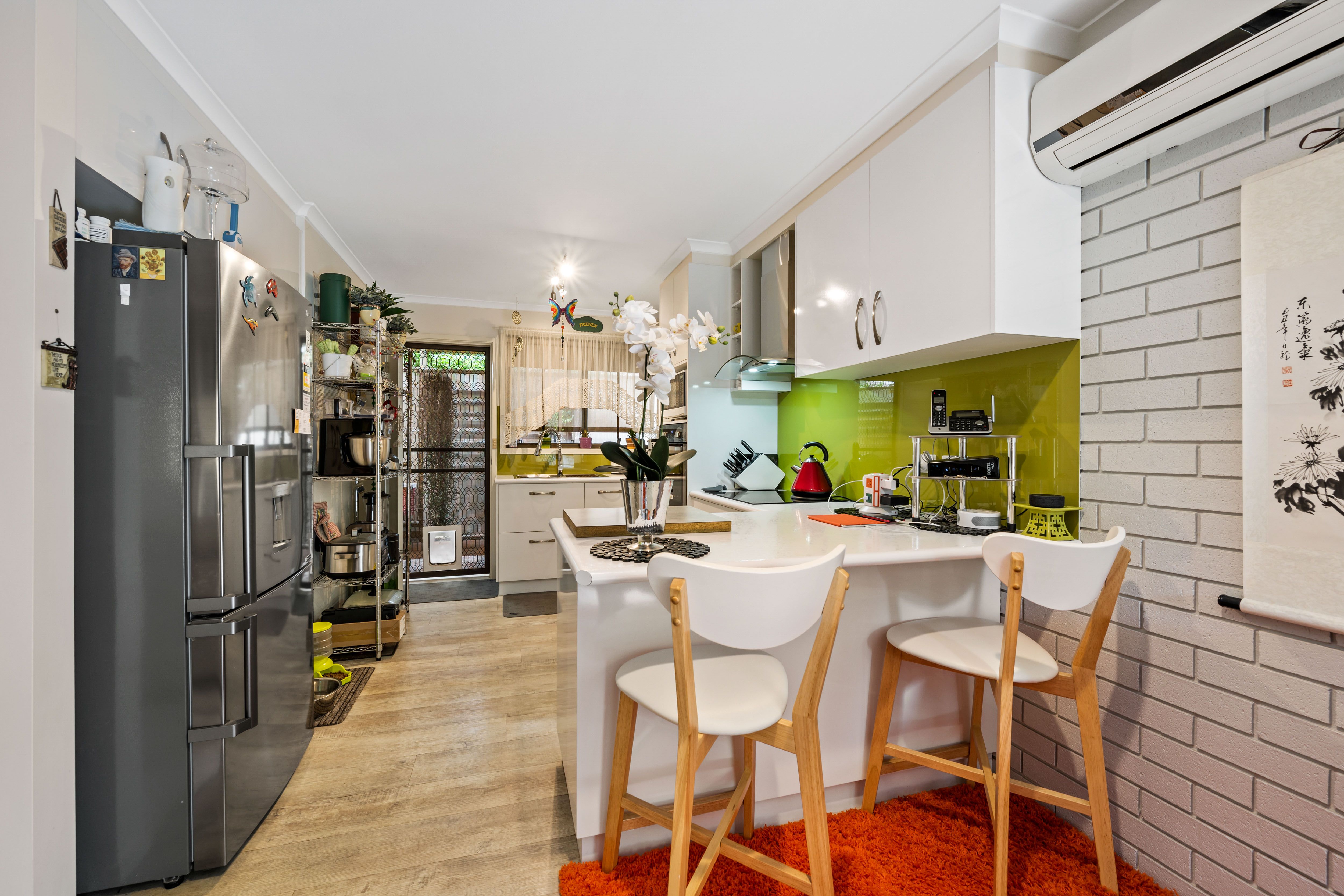 The light-filled living space features a ceiling fan and opens onto a peaceful and private outdoor patio. The kitchen is equipped with modern appliances, plenty of bench space, and a breakfast bar.