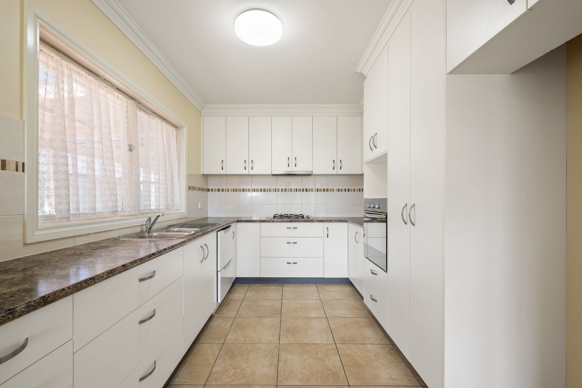 Step inside to discover a spacious and sunlit living and dining area, with large windows that bathe the space in natural light. A split system ensures year-round comfort, while sliding doors open to the rear, creating seamless indoor-outdoor flow. The generous kitchen is both stylish and functional, featuring abundant cabinetry, attractive benchtops, double sink and gas cooktop.