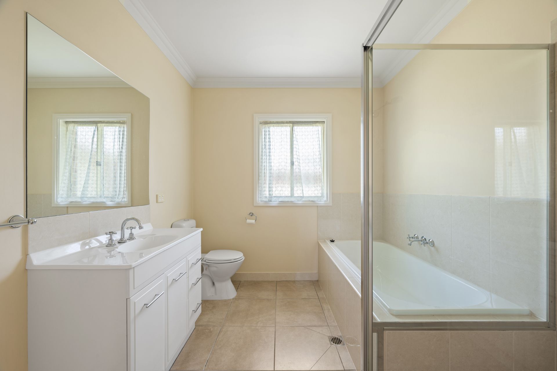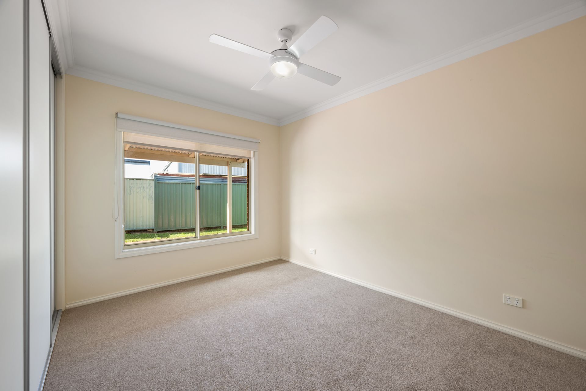 Accommodation includes a light-filled master bedroom with garden views, ceiling fan and private ensuite. The two additional bedrooms are both fitted with large built-in robes and ceiling fans. The main bathroom is finished in a neutral palette and includes a full-sized bath.