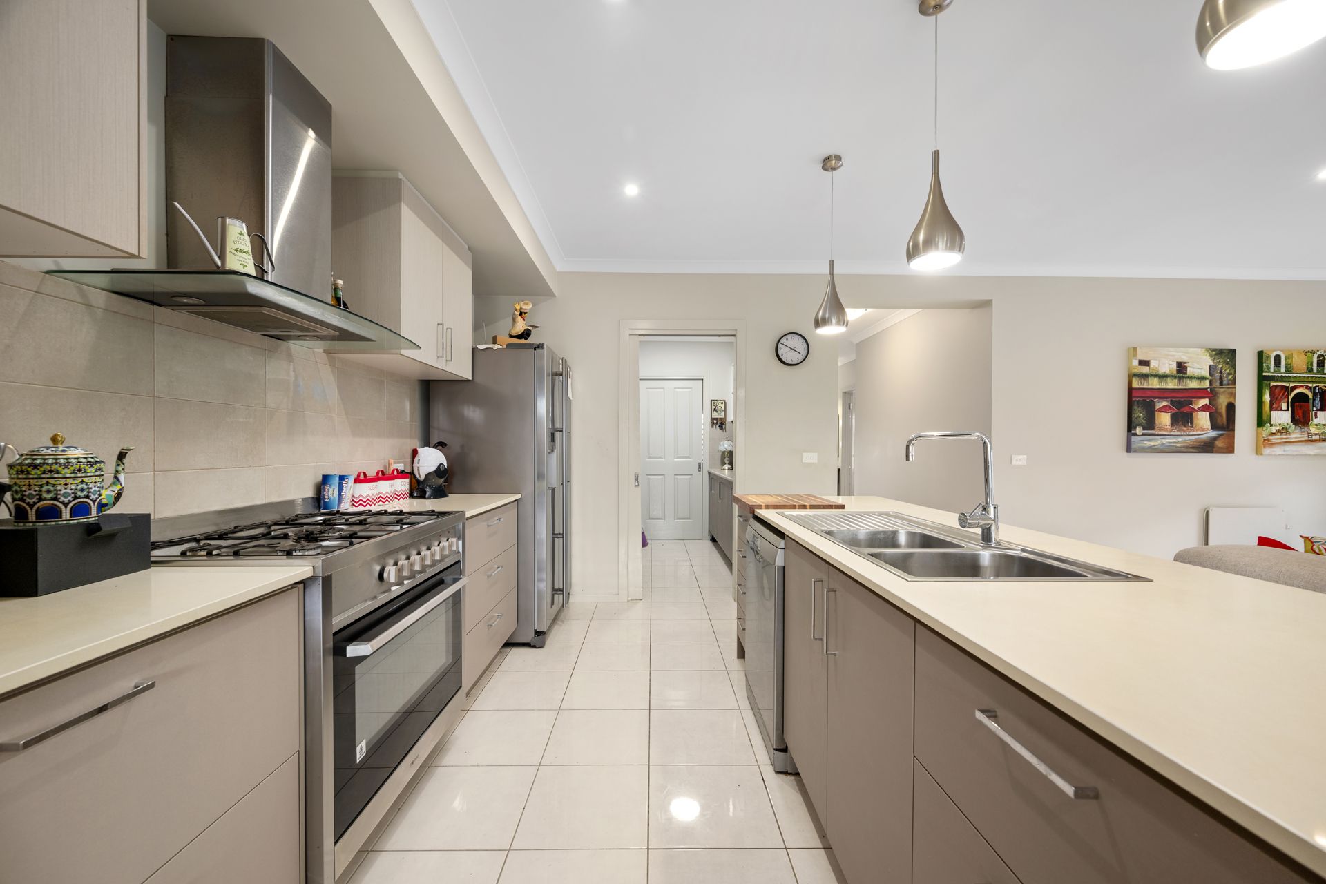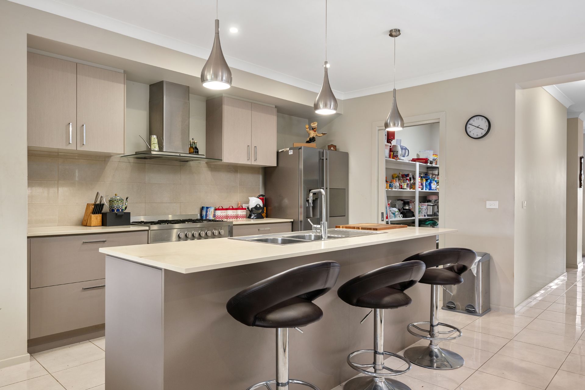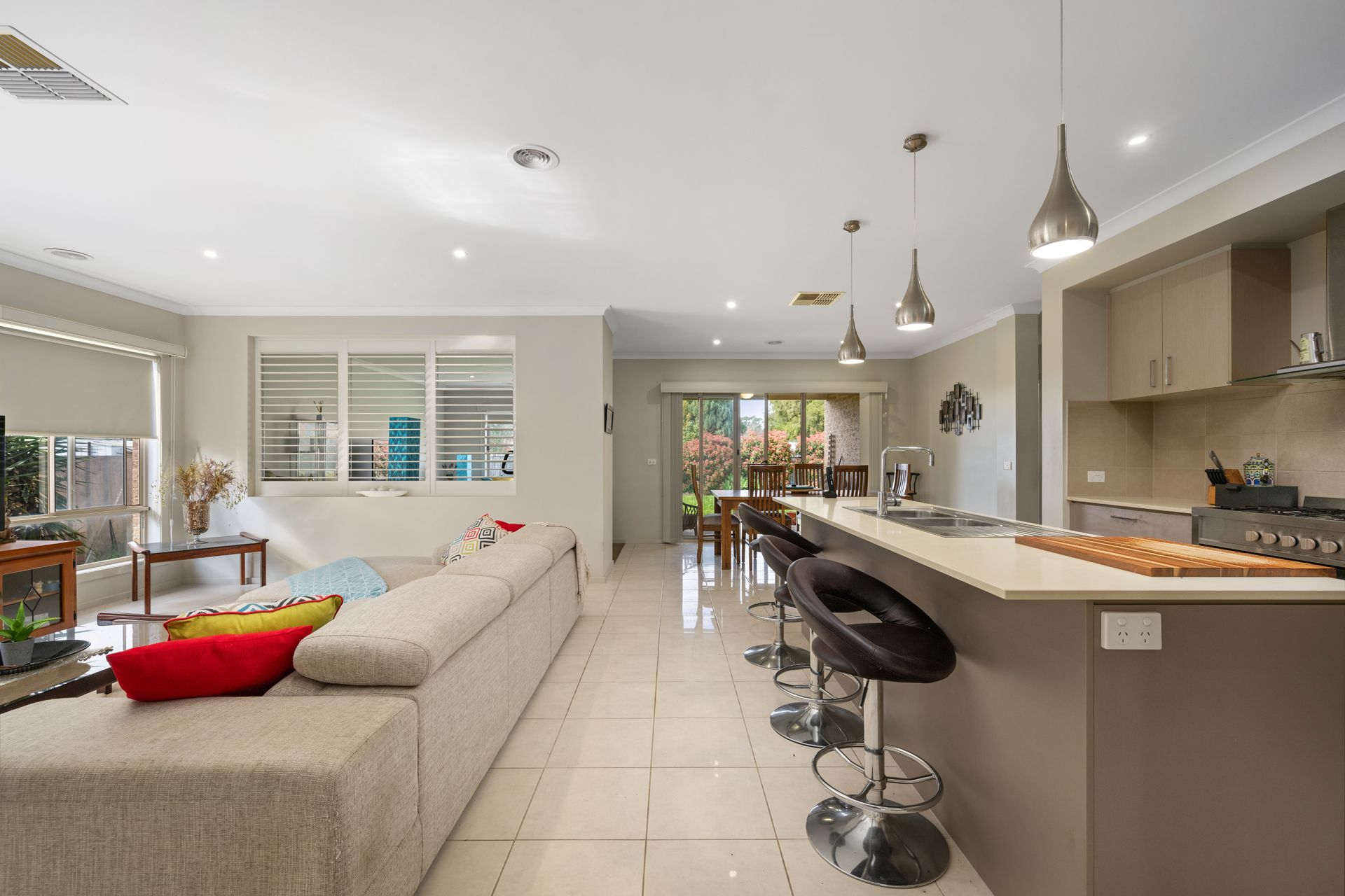 A light-filled open-plan kitchen, living, and dining area awaits inside, designed with both comfort and entertaining in mind. The modern kitchen is a standout, featuring a breakfast bar, eye-catching tile splash back, quality gas cooktop, and a butler’s pantry with abundant storage.