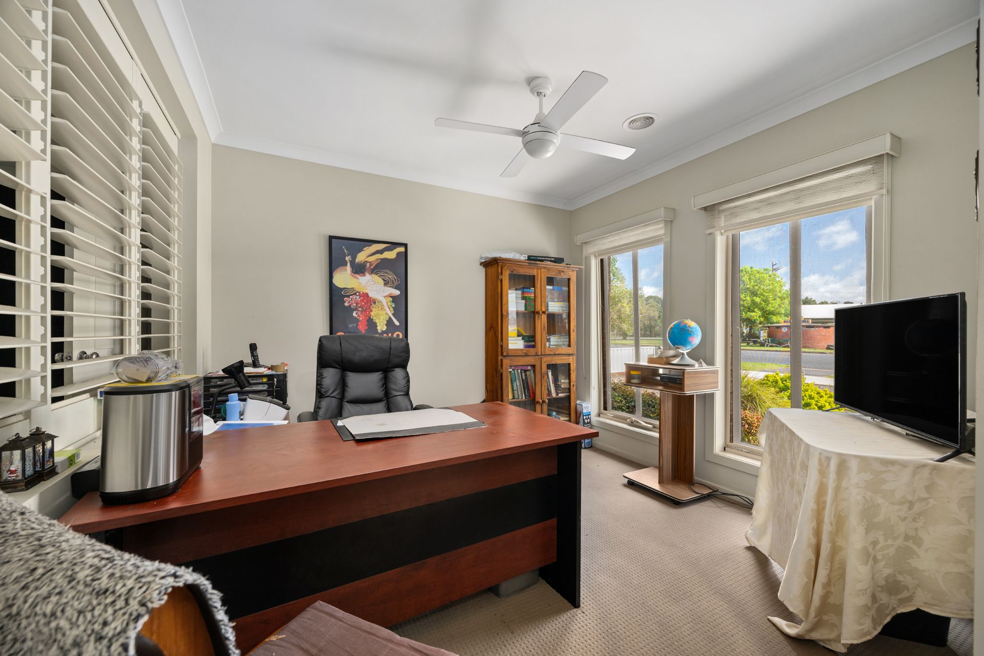 The master bedroom is complete with a sleek ensuite and spacious walk-in robe. Two additional bedrooms each offer built-in robes and share a central bathroom with a bath and separate toilet. A sunny home office at the front of the home provides the ideal work-from-home setup or study space.