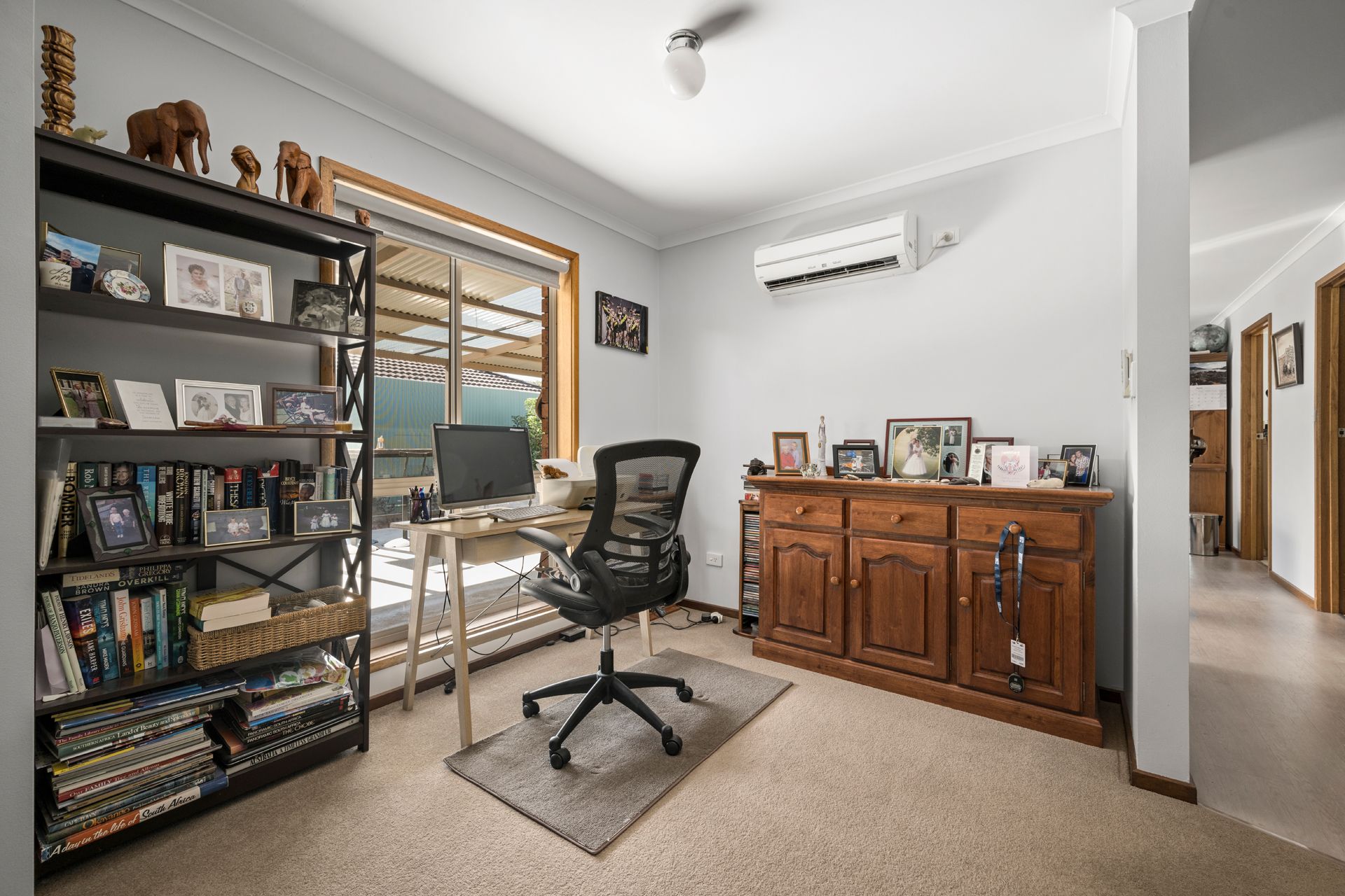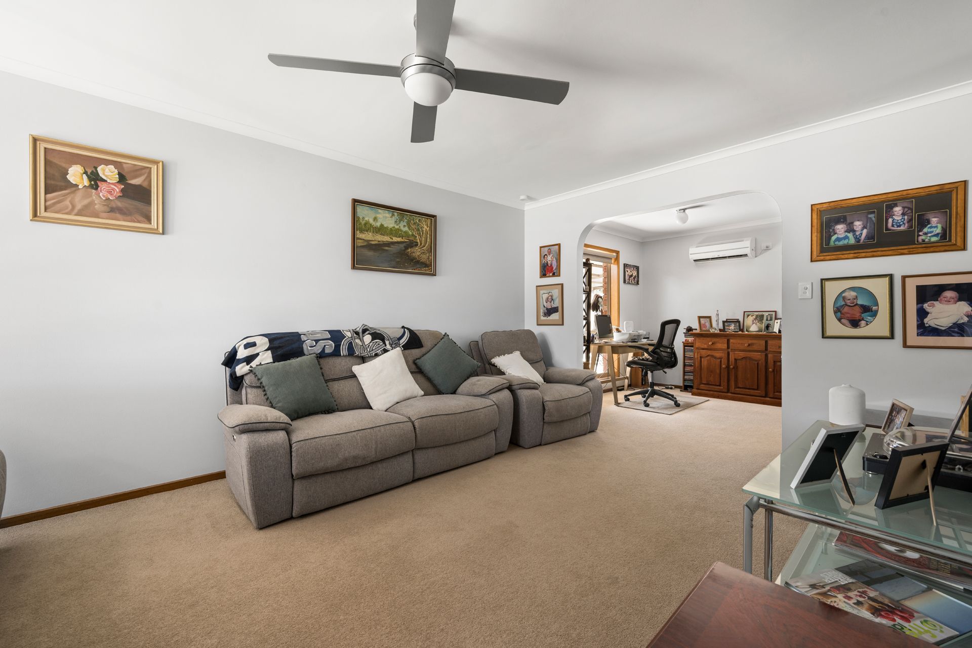 Inside presents three bedrooms that all feature built-in robes, and a neat central bathroom complete with a bath. Relax in the cosy front living room, equipped with a split system and windows overlooking the sunny front garden. An adjoining space offers flexibility for use as a study or additional sitting area.