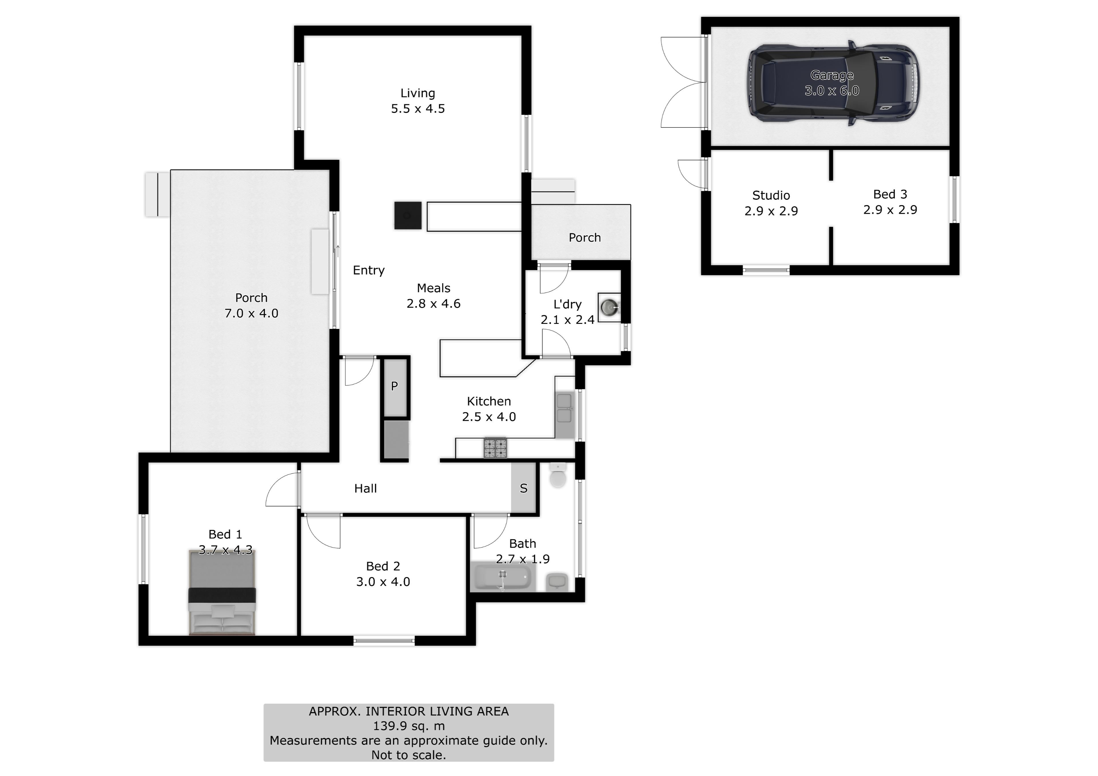 Outside, you have a tidy backyard with an additional back studio room and a third bedroom that is complimented by polished timber floors.