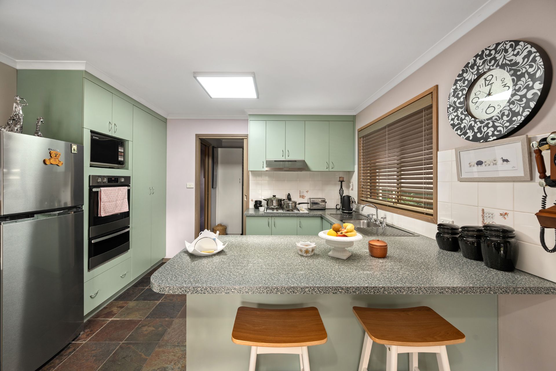 Step inside to a warm and inviting open-plan living, kitchen, and dining area, where large windows draw in natural light and offer pleasant garden views. Ducted gas heating and a wall heater ensures cosy comfort in cooler months, while evaporative cooling keeps the home fresh through summer. The kitchen is both functional and well-presented, featuring a gas cooktop, tiled splashback, and a generous breakfast bar for casual meals or entertaining.