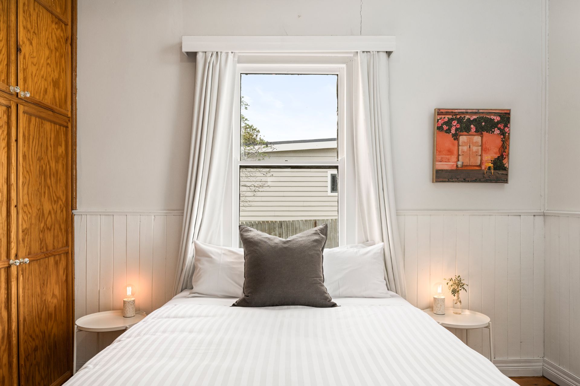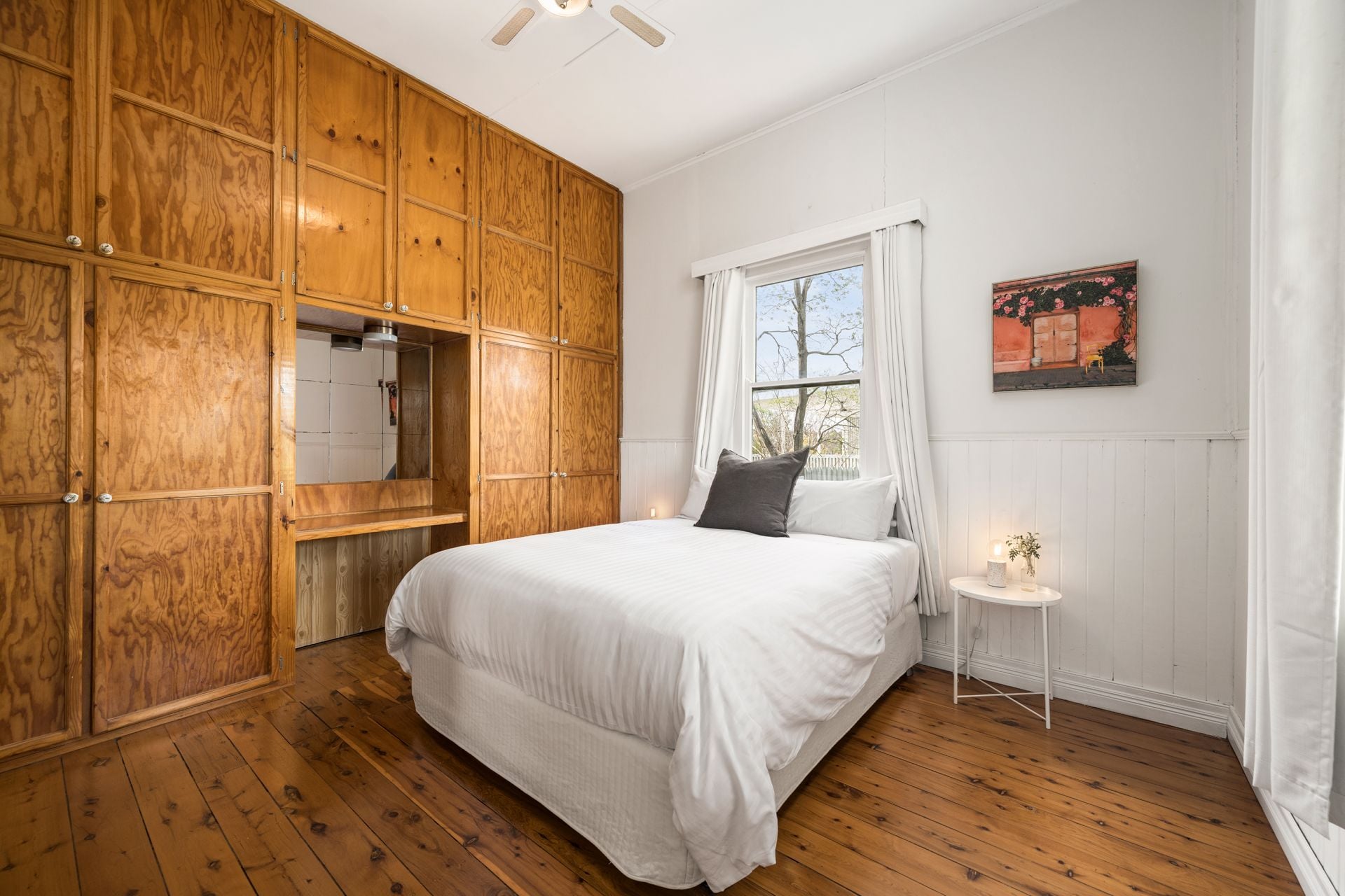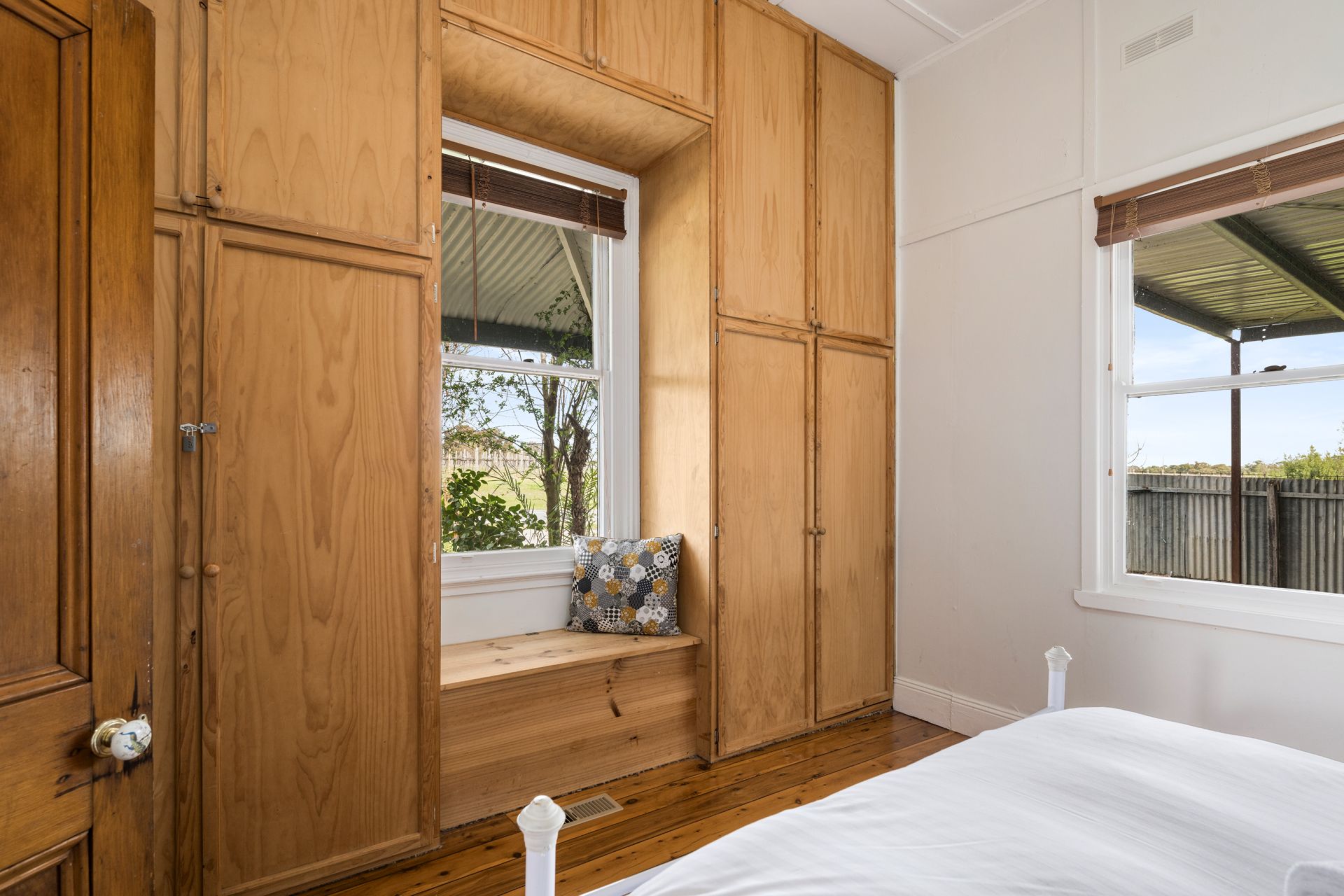 The home offers three light-filled and spacious bedrooms, with the two front bedrooms featuring original built-in cupboards and storage. The functional bathroom layout includes a bath, complemented by a vintage basin and charming tilework that enhances the home's period appeal.
