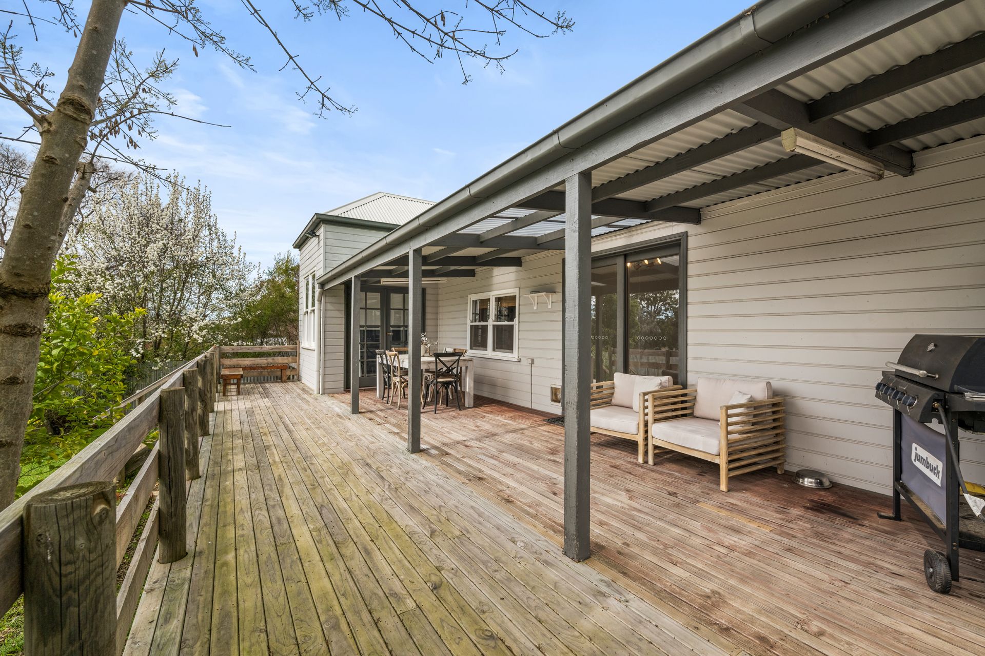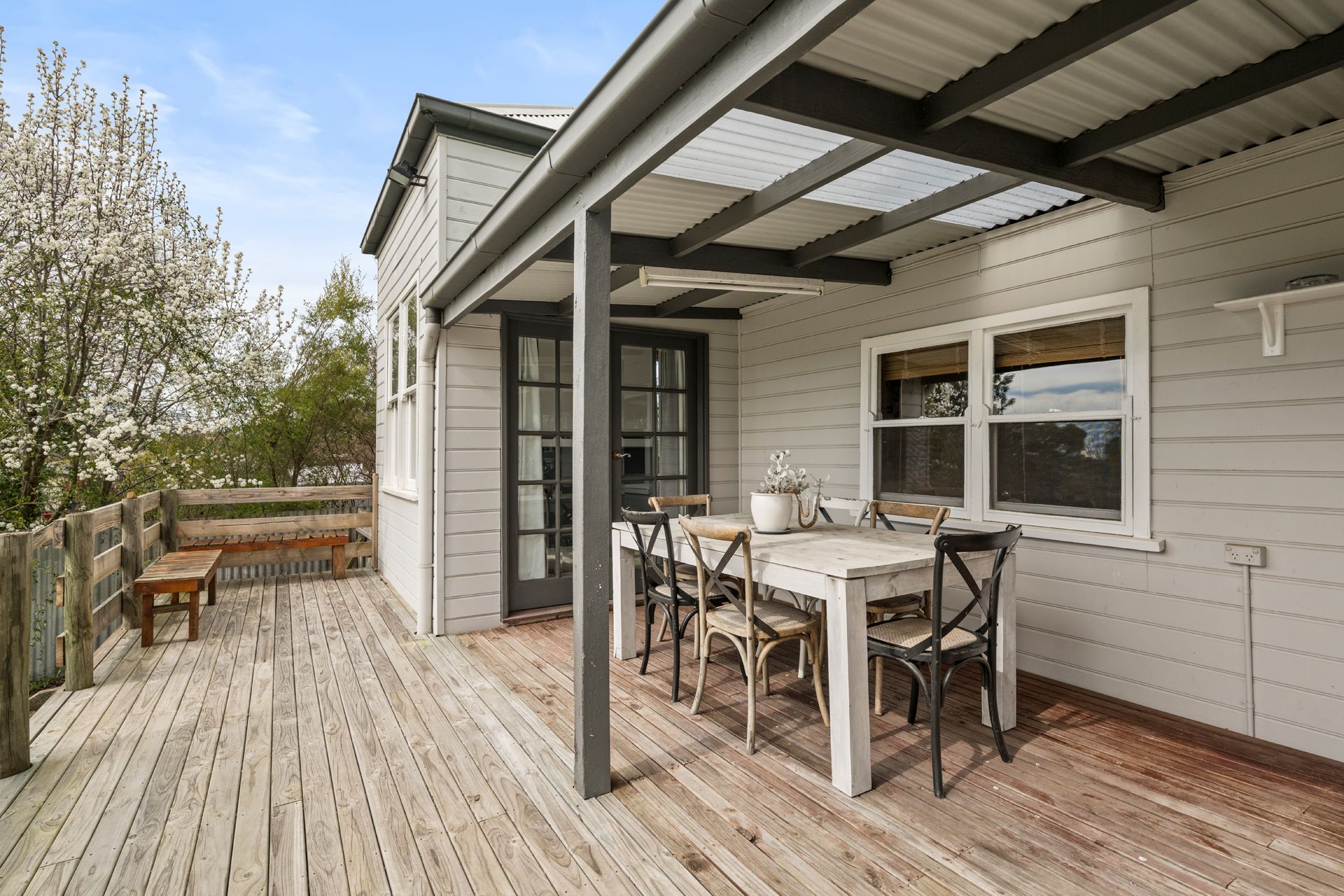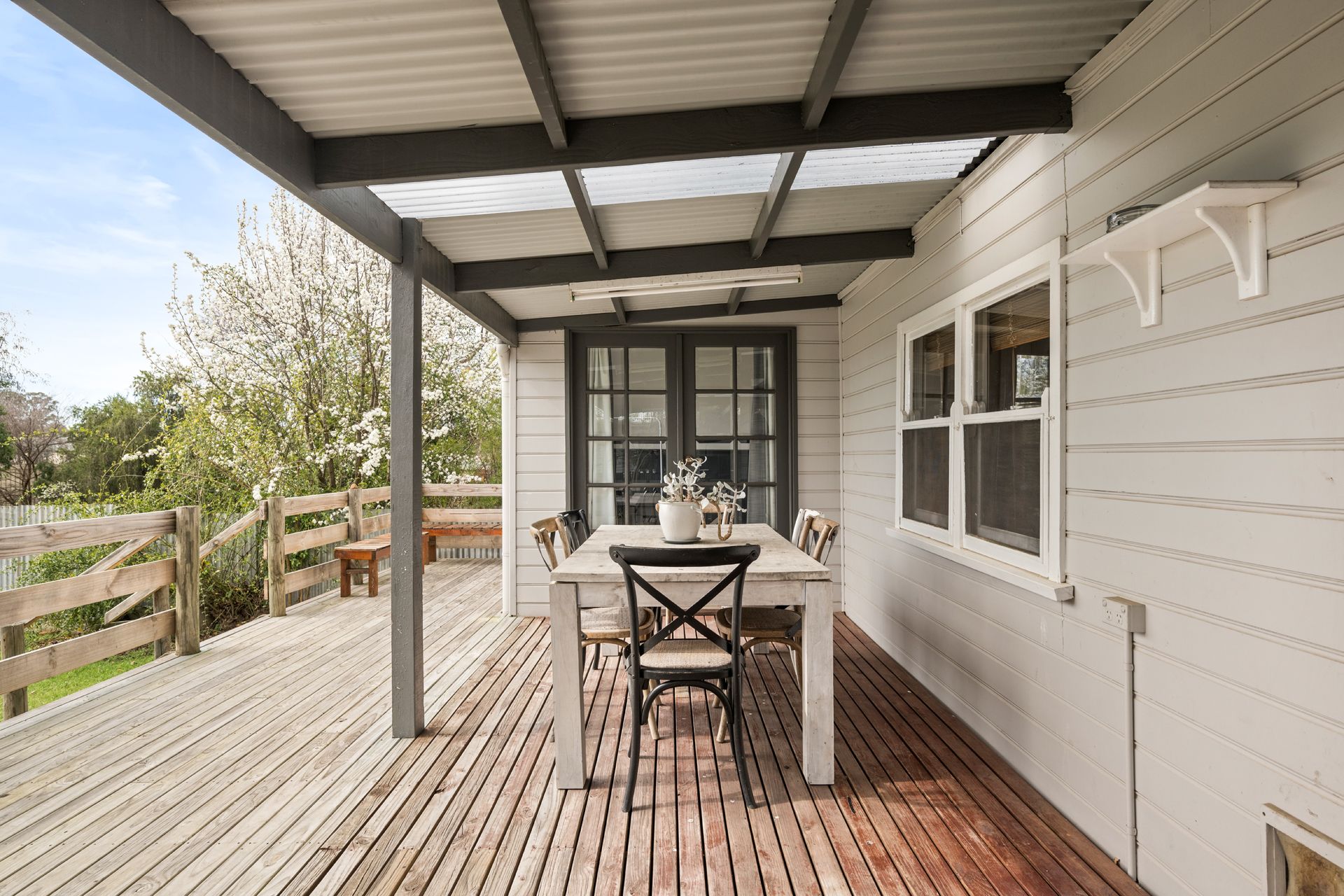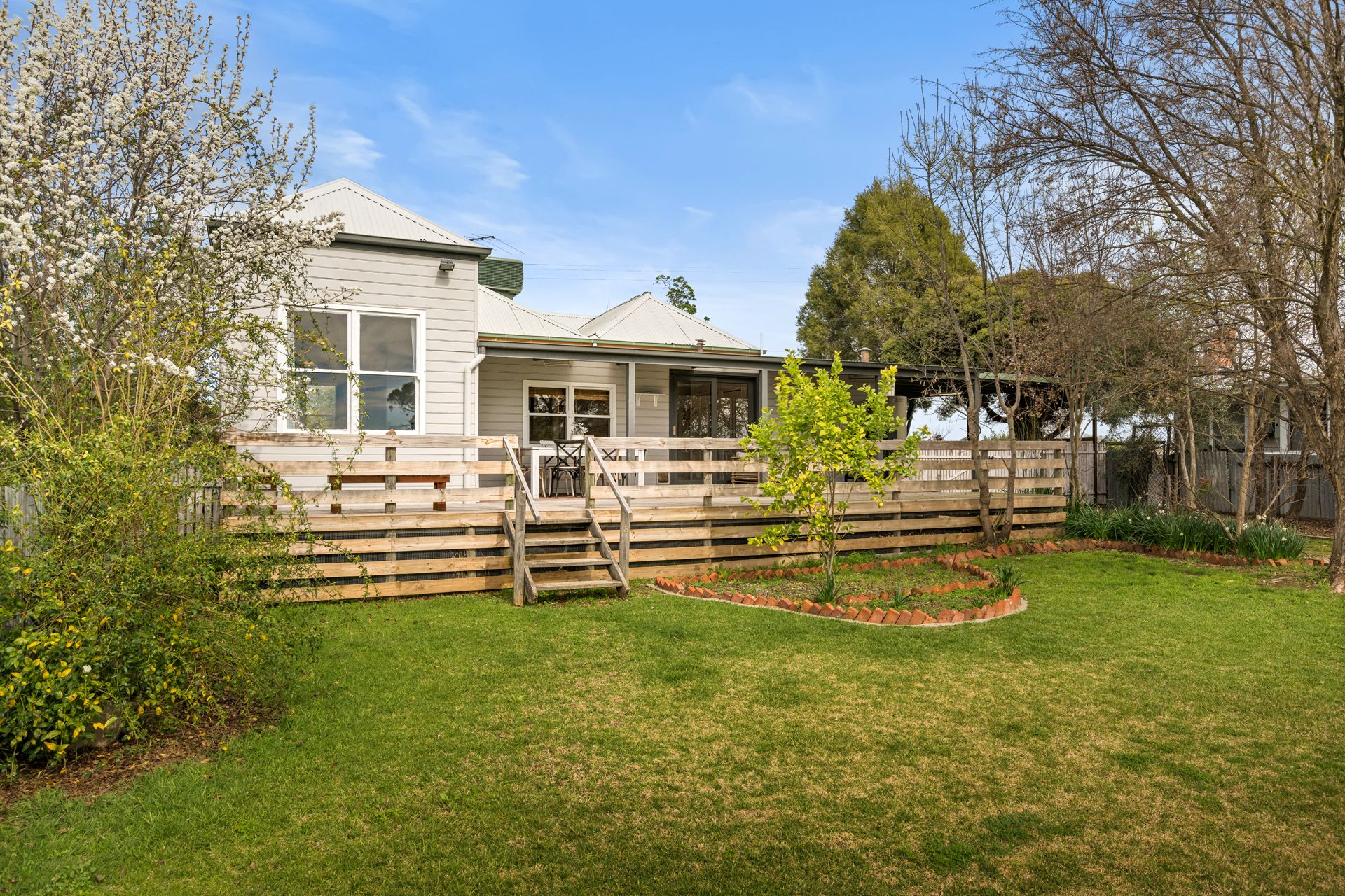 An expansive decked verandah at the rear of the home provides the perfect space for entertaining on sunny afternoons, and overlooks the neat back garden with pretty garden beds and established trees.
