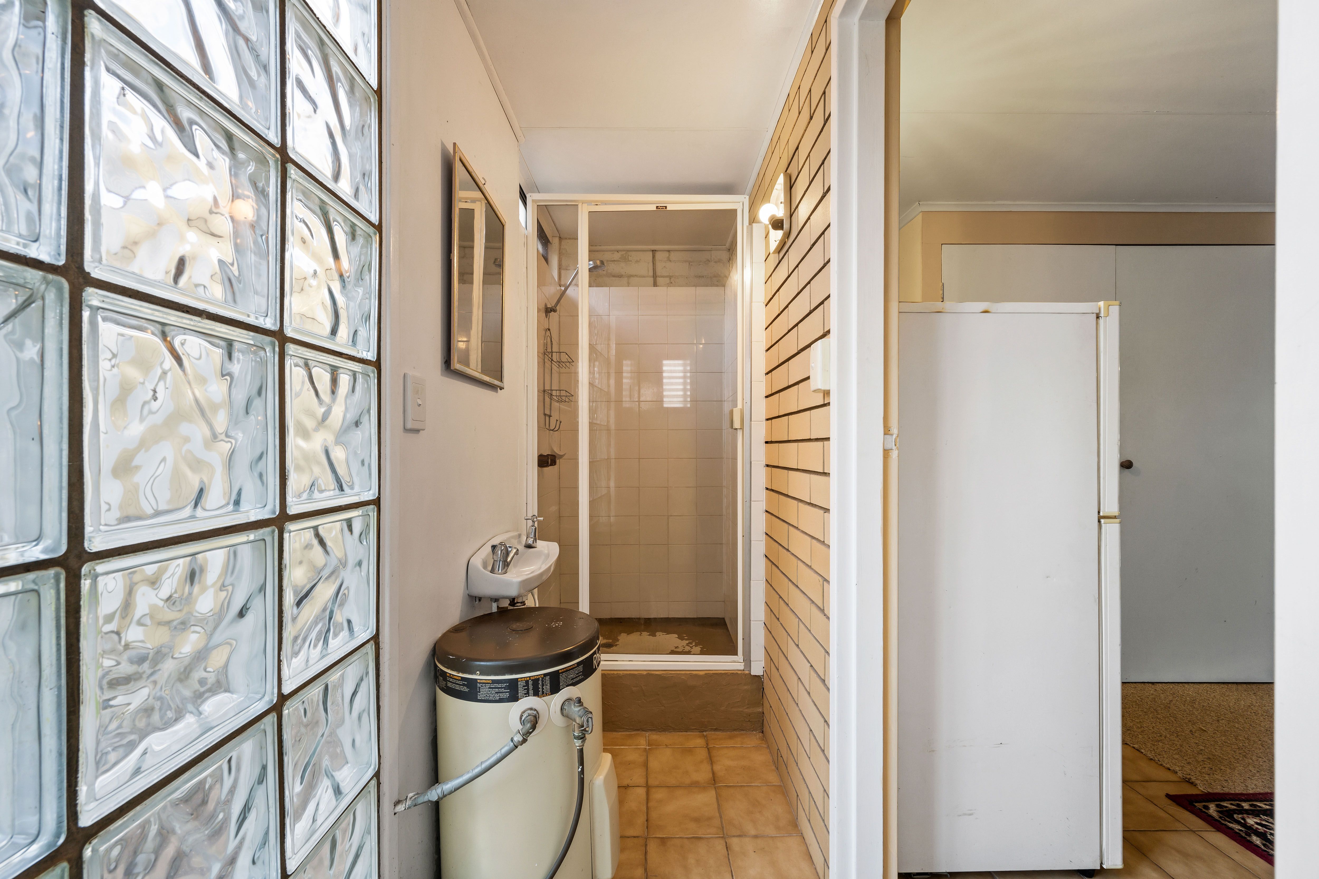 The central bathroom features a large claw bath, while the separate laundry, and a linen cupboard.