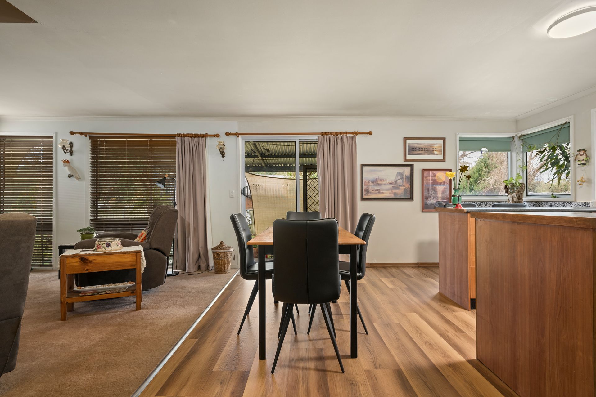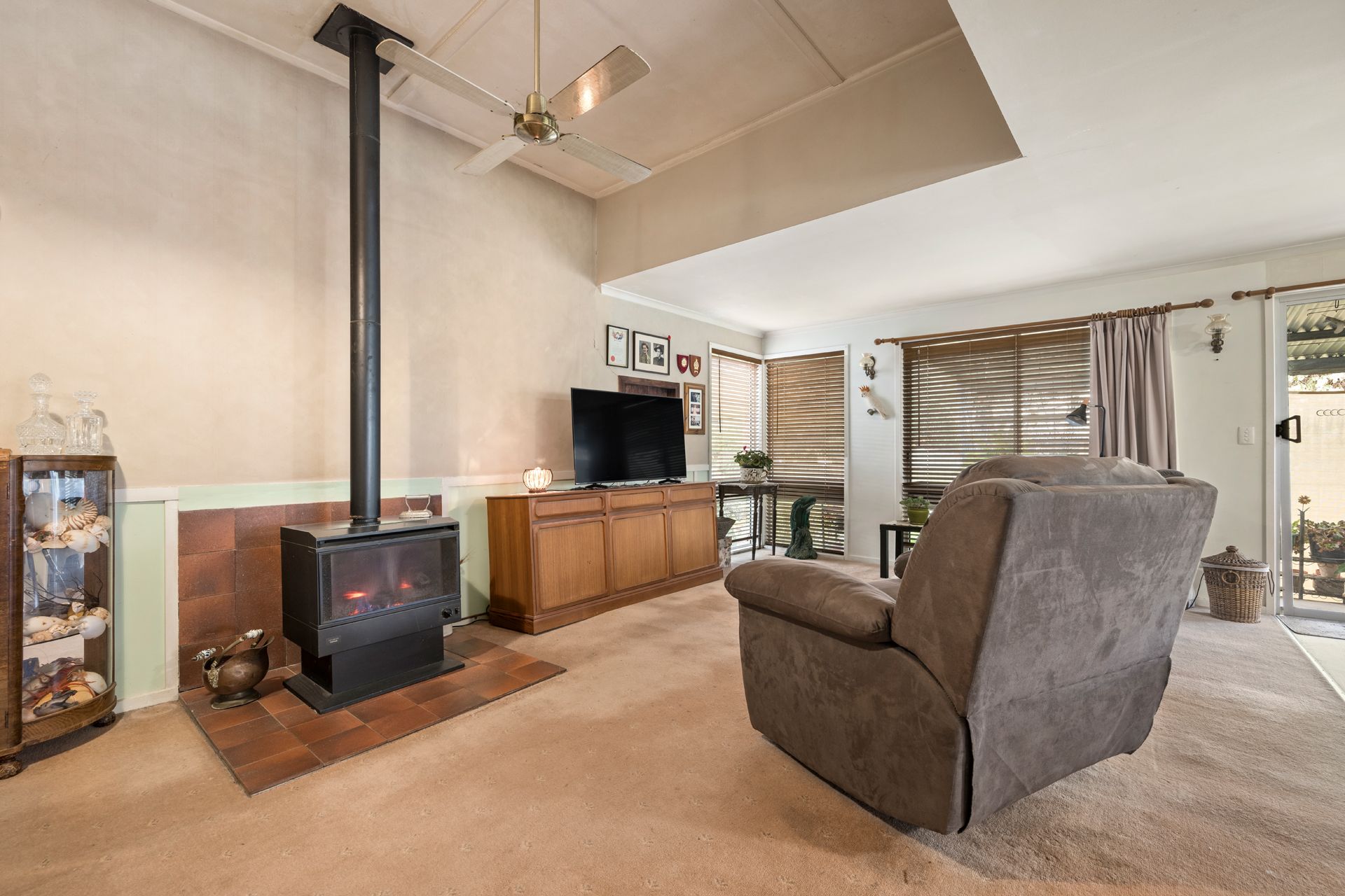 The large and homely open-plan living, kitchen and dining area offers a flexible layout and a gas fireplace, while the kitchen features a gas cooktop, breakfast bar, and island bench. Evaporative air conditioning throughout ensures comfort during the warmer months, and a handy storage cupboard provides additional space.