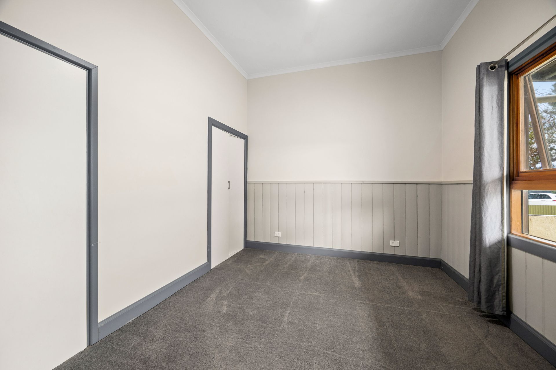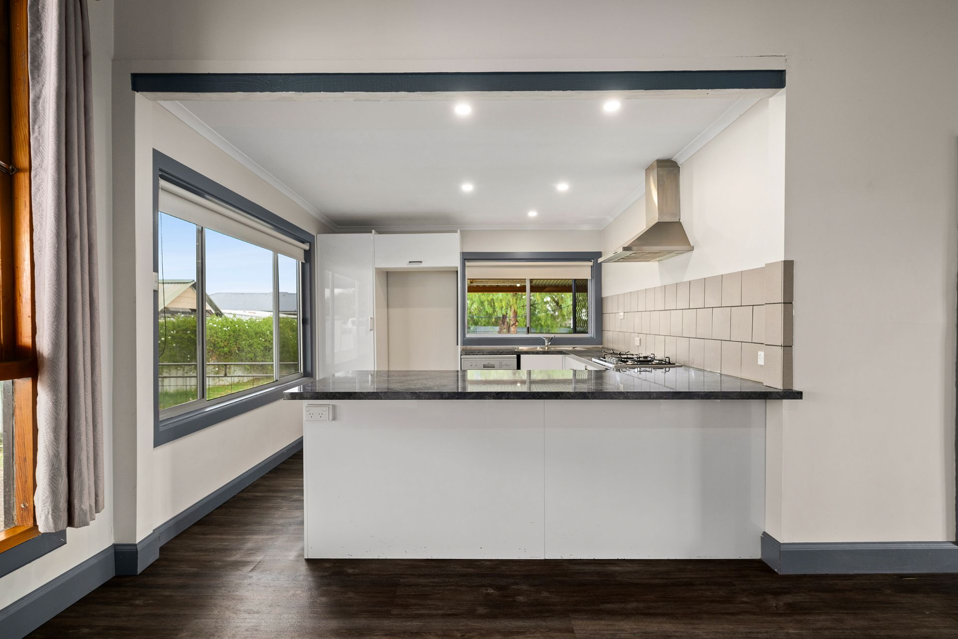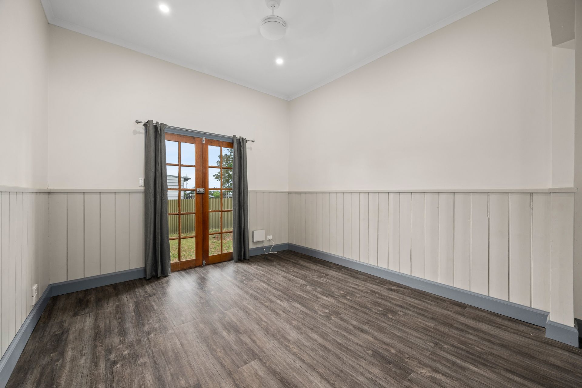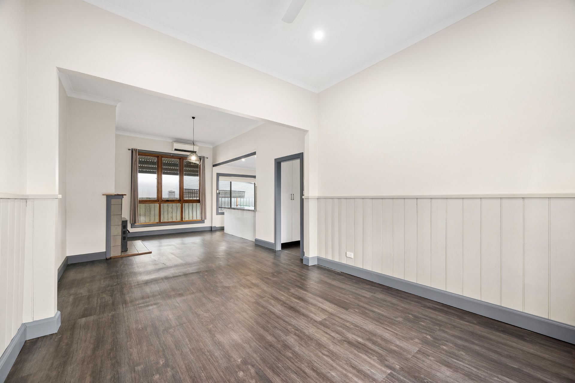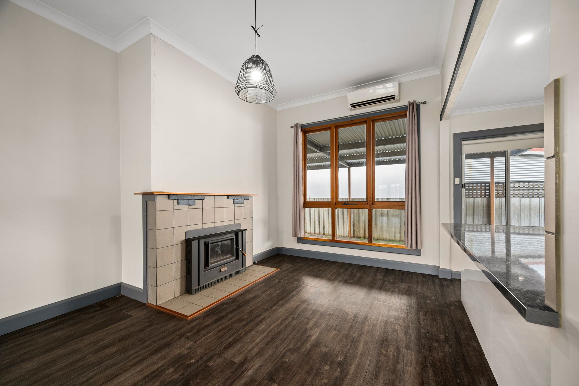 The open-plan living and dining area is bathed in natural light, with elegant French doors leading to a private side courtyard-ideal for relaxing or entertaining. A fully tiled wood fire and split system ensure year-round comfort in the inviting living space.