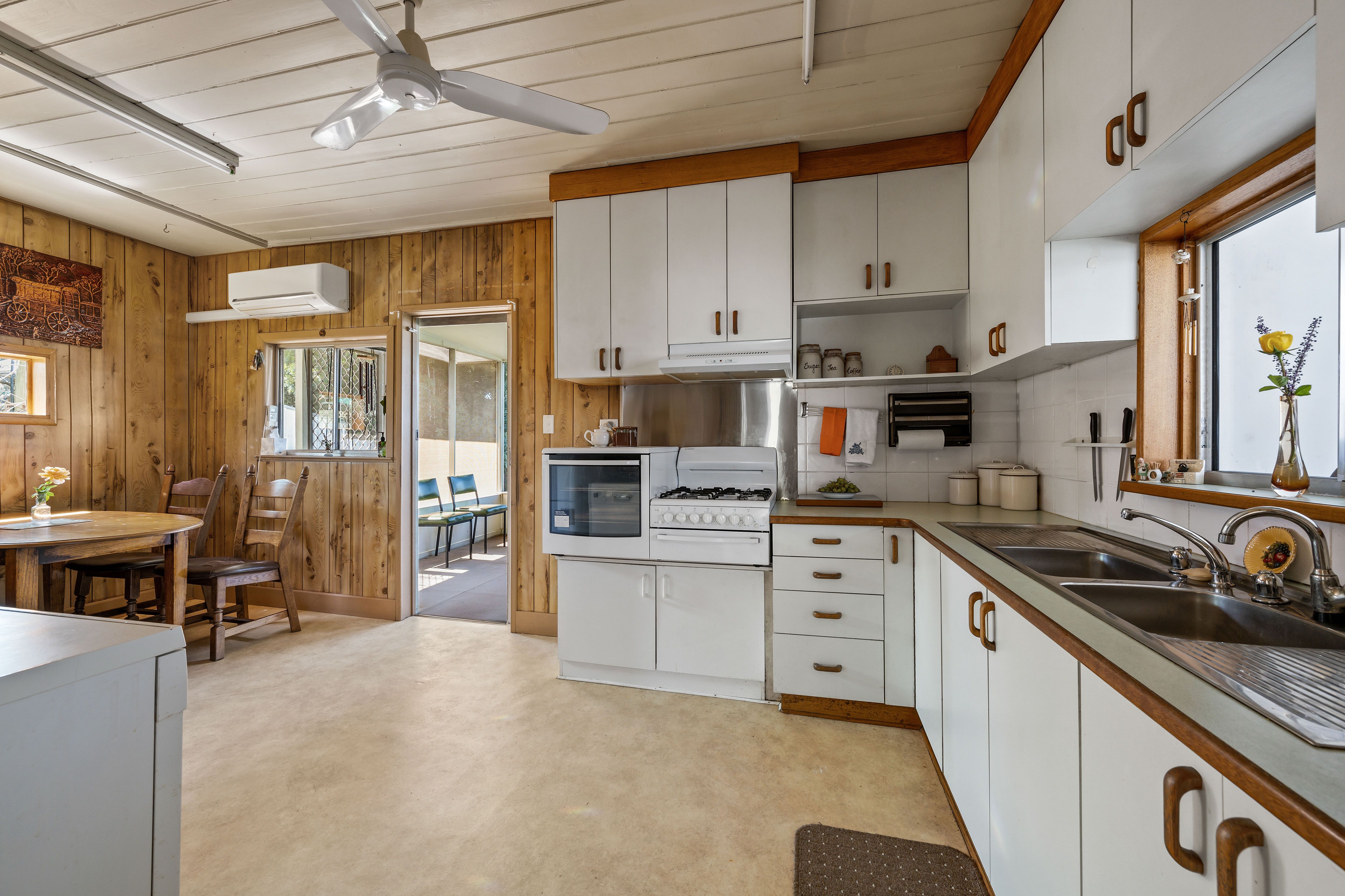 The kitchen is equipped with a gas cooktop and electric oven, and features plenty of bench space and abundant storage.