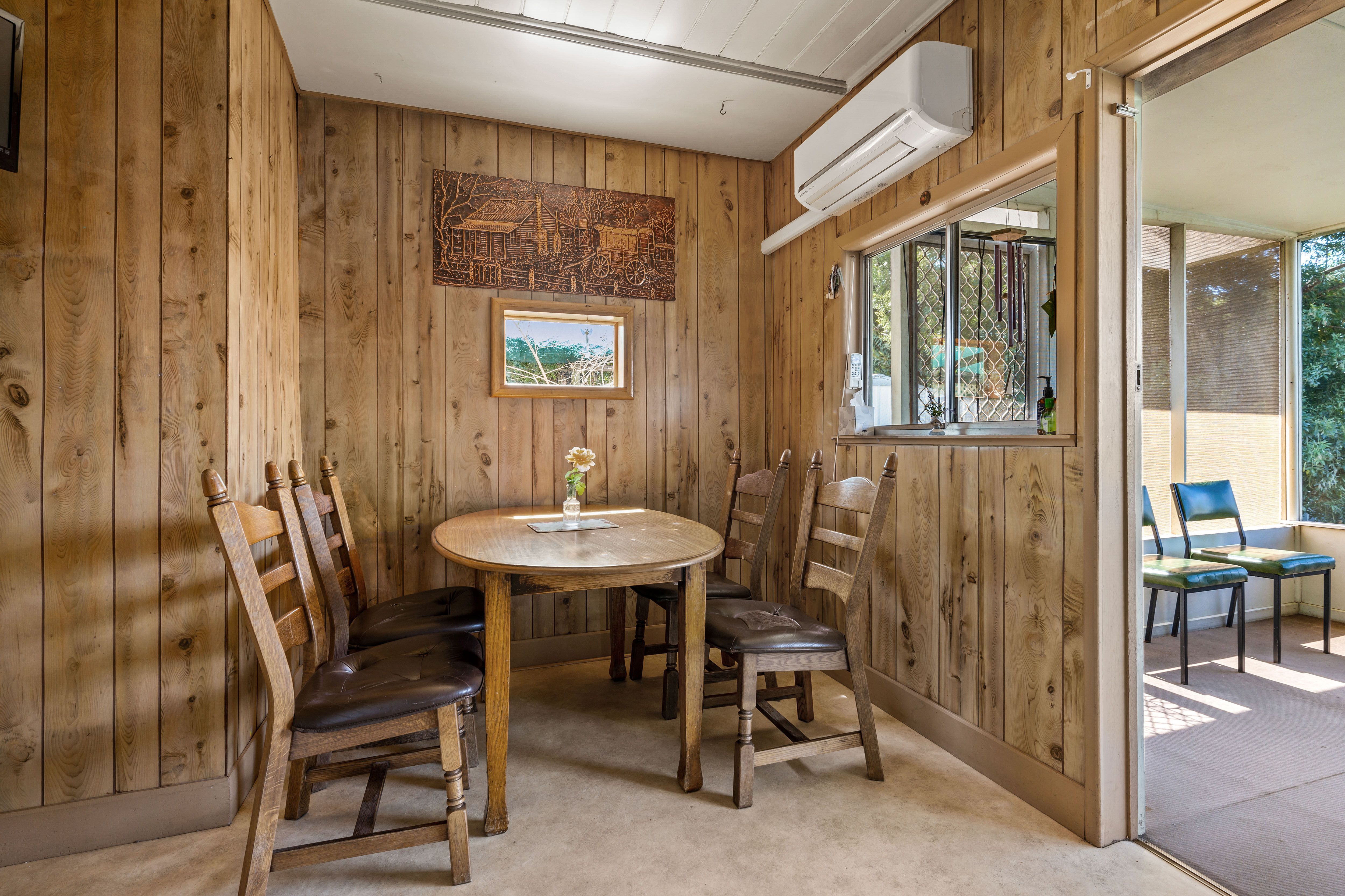 Inside, you'll find three bedrooms and two bathrooms, as well as two sitting areas which provide plenty of space for families or couples alike. The main living area is lovely and bright, has a ceiling fan and a split system and features charming wood panelling on the walls and ceiling.