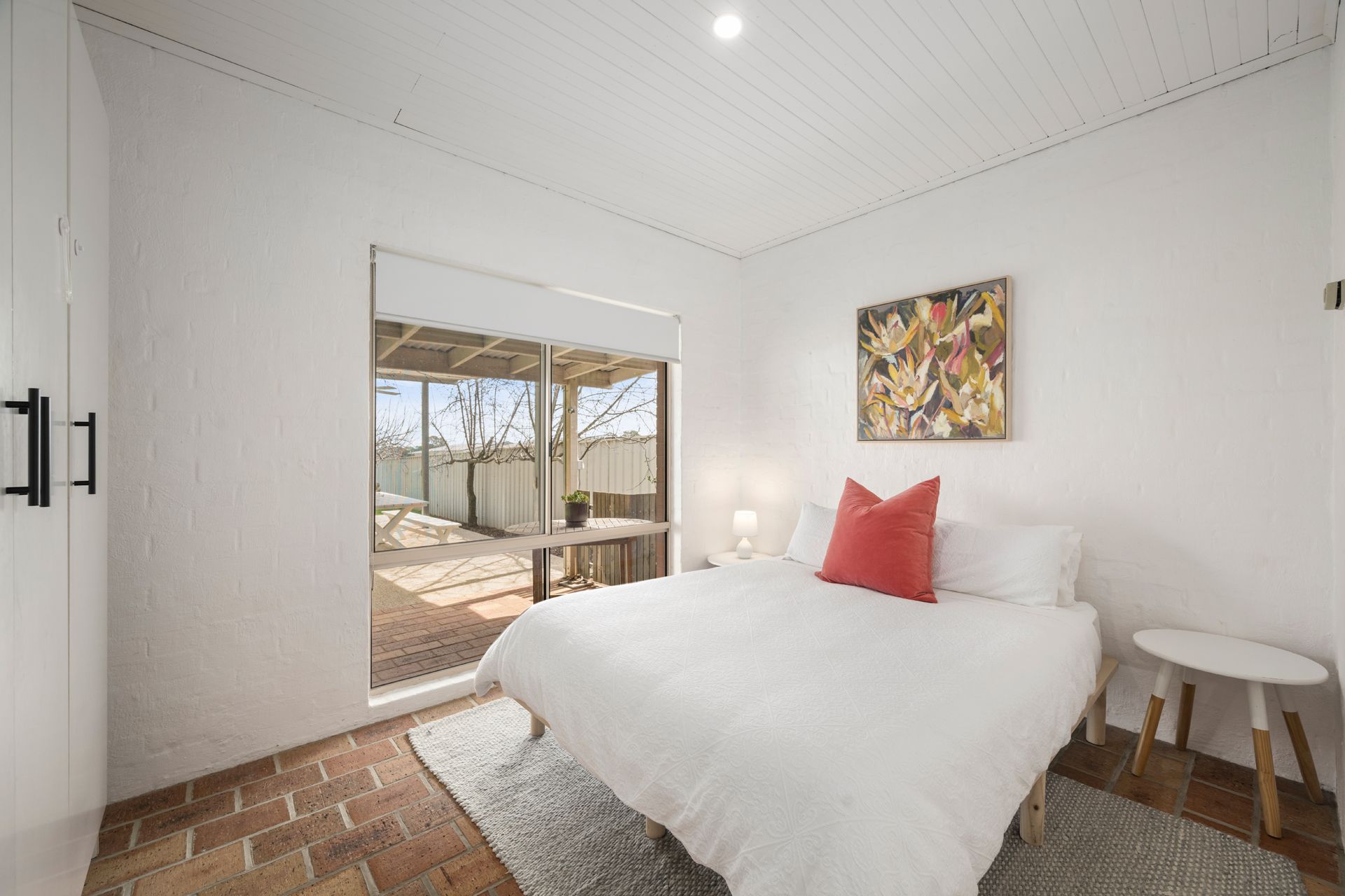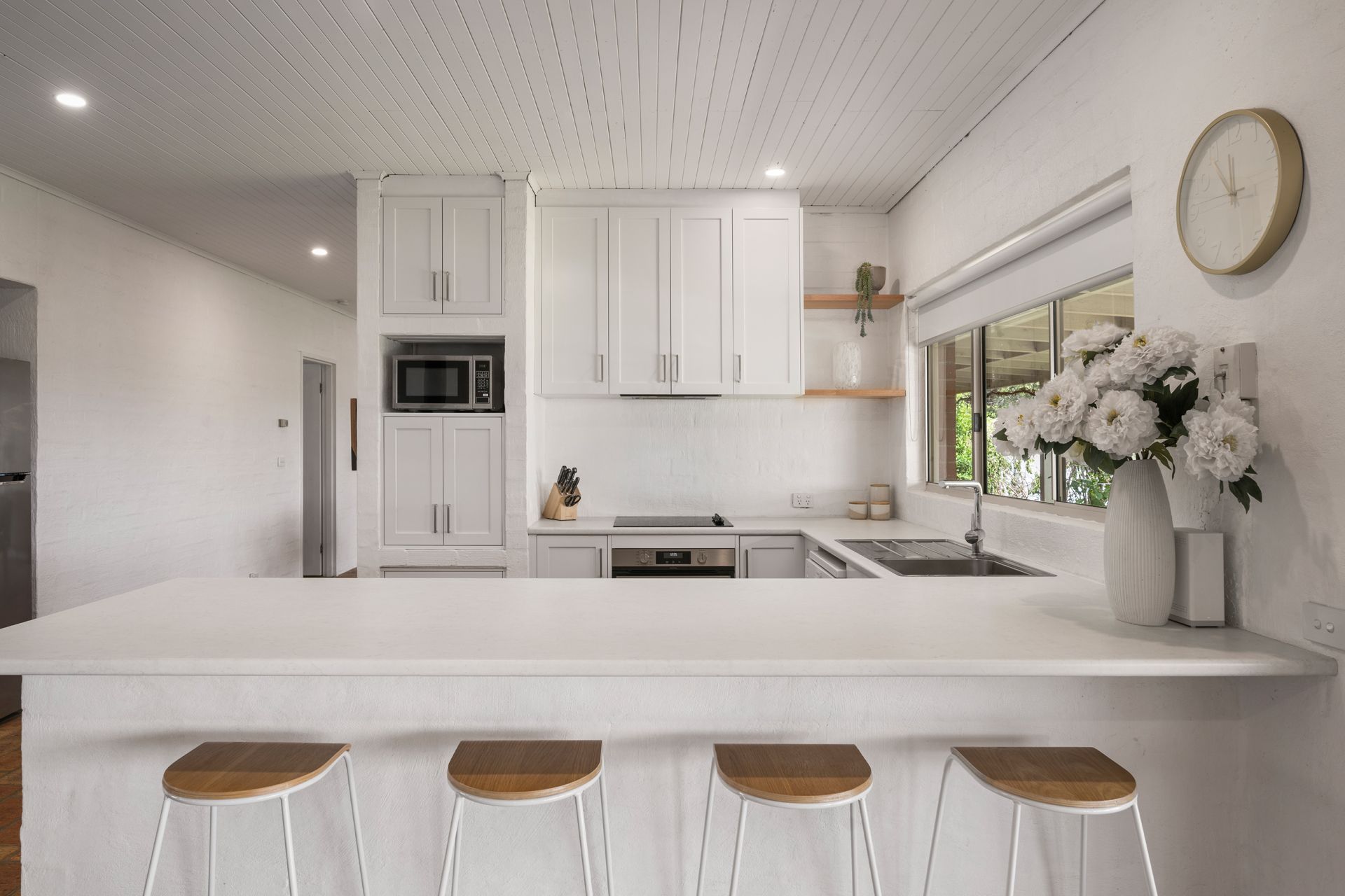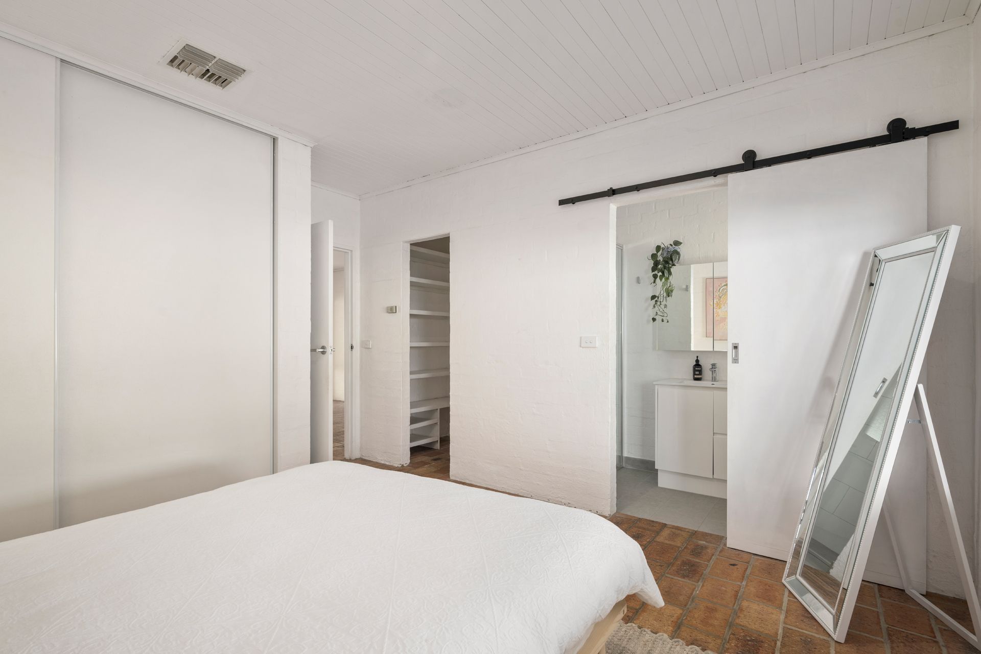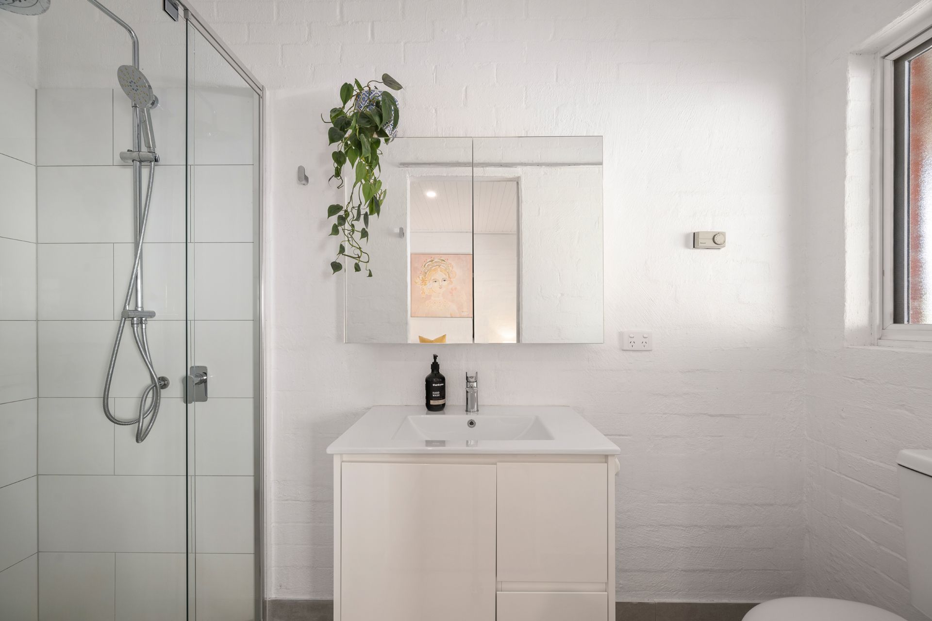 The home offers three bedrooms, with the master bedroom including a walk-in robe and an ensuite. The beautifully renovated main bathroom is bright and warm, with a crisp white finish and contemporary fixtures.
