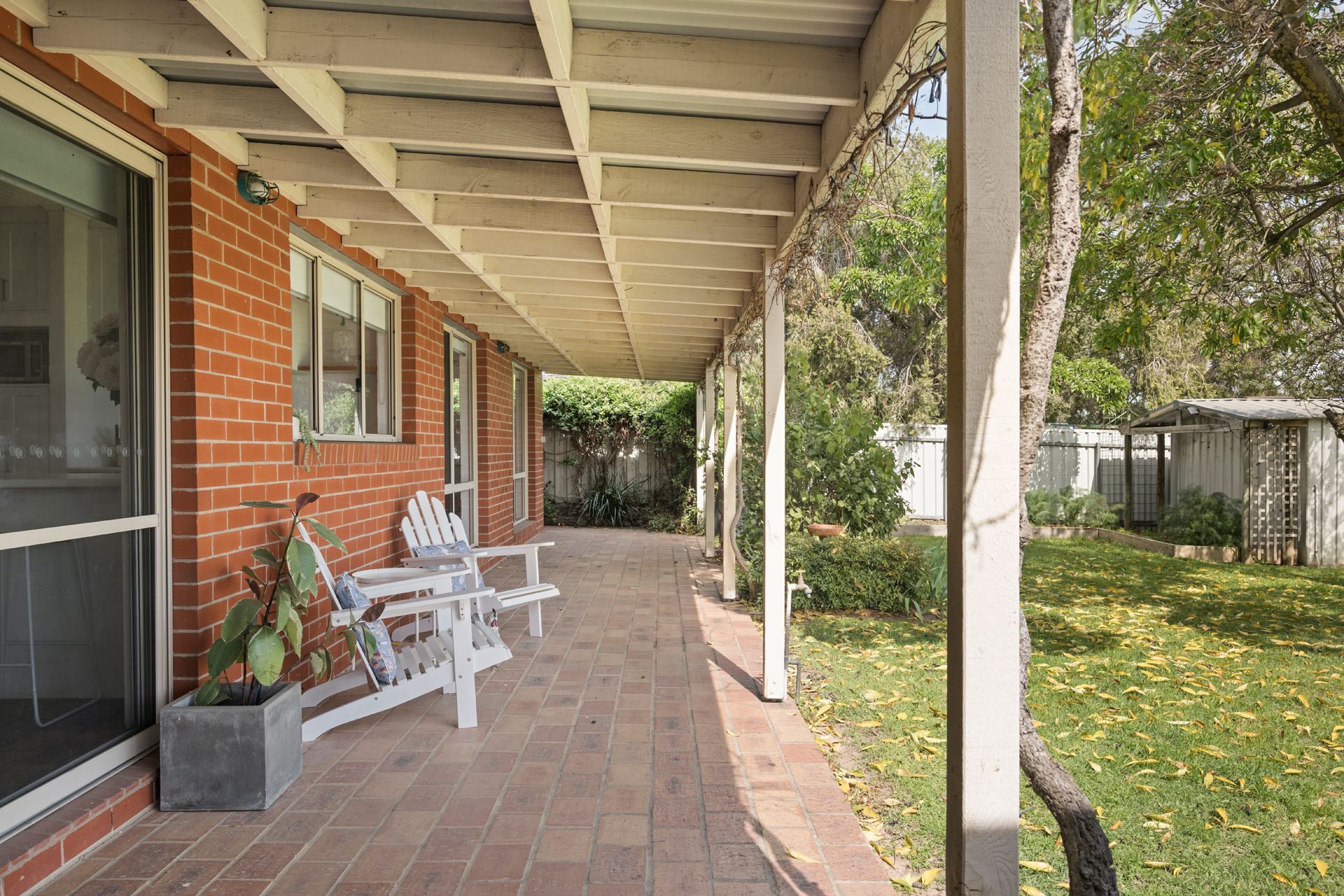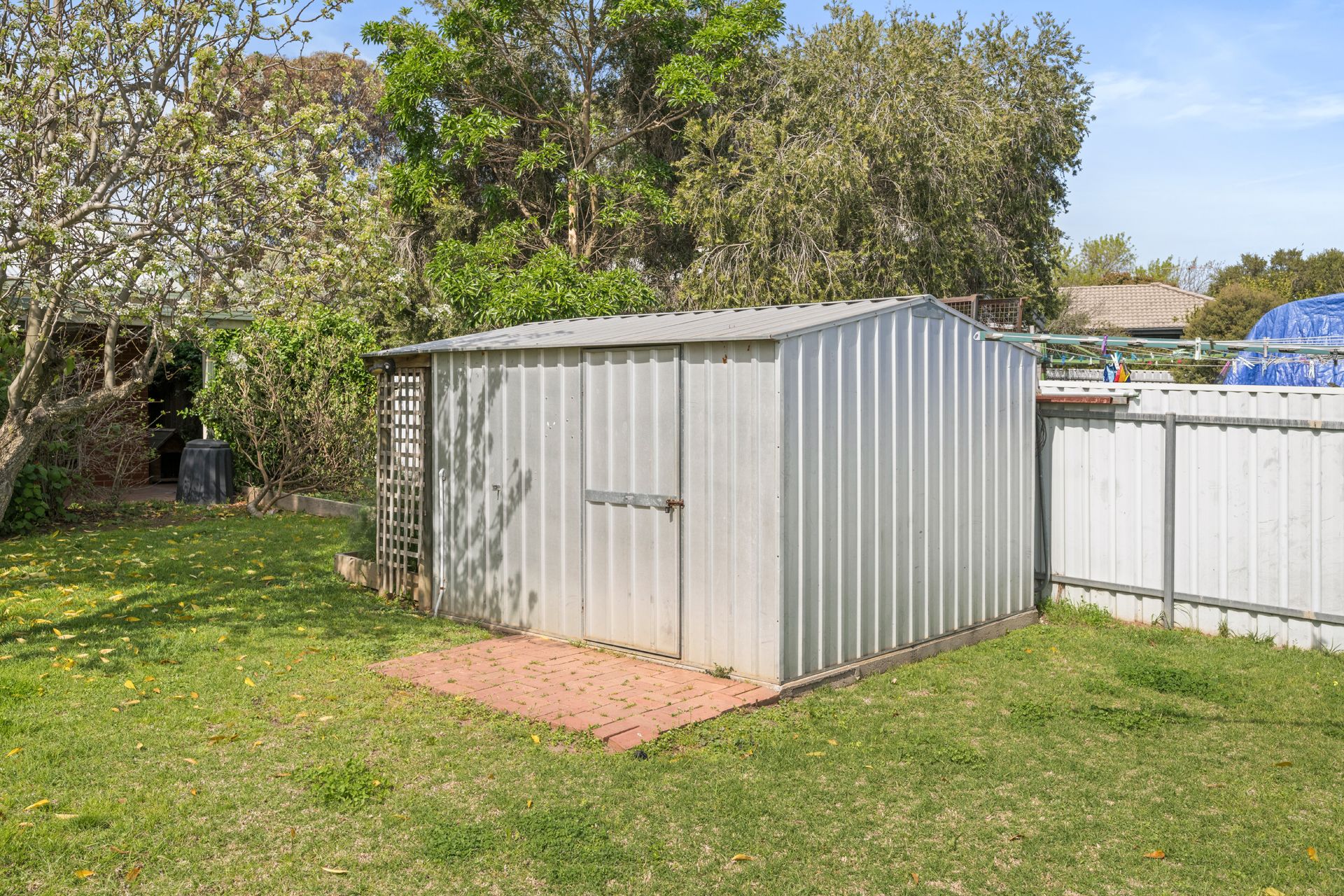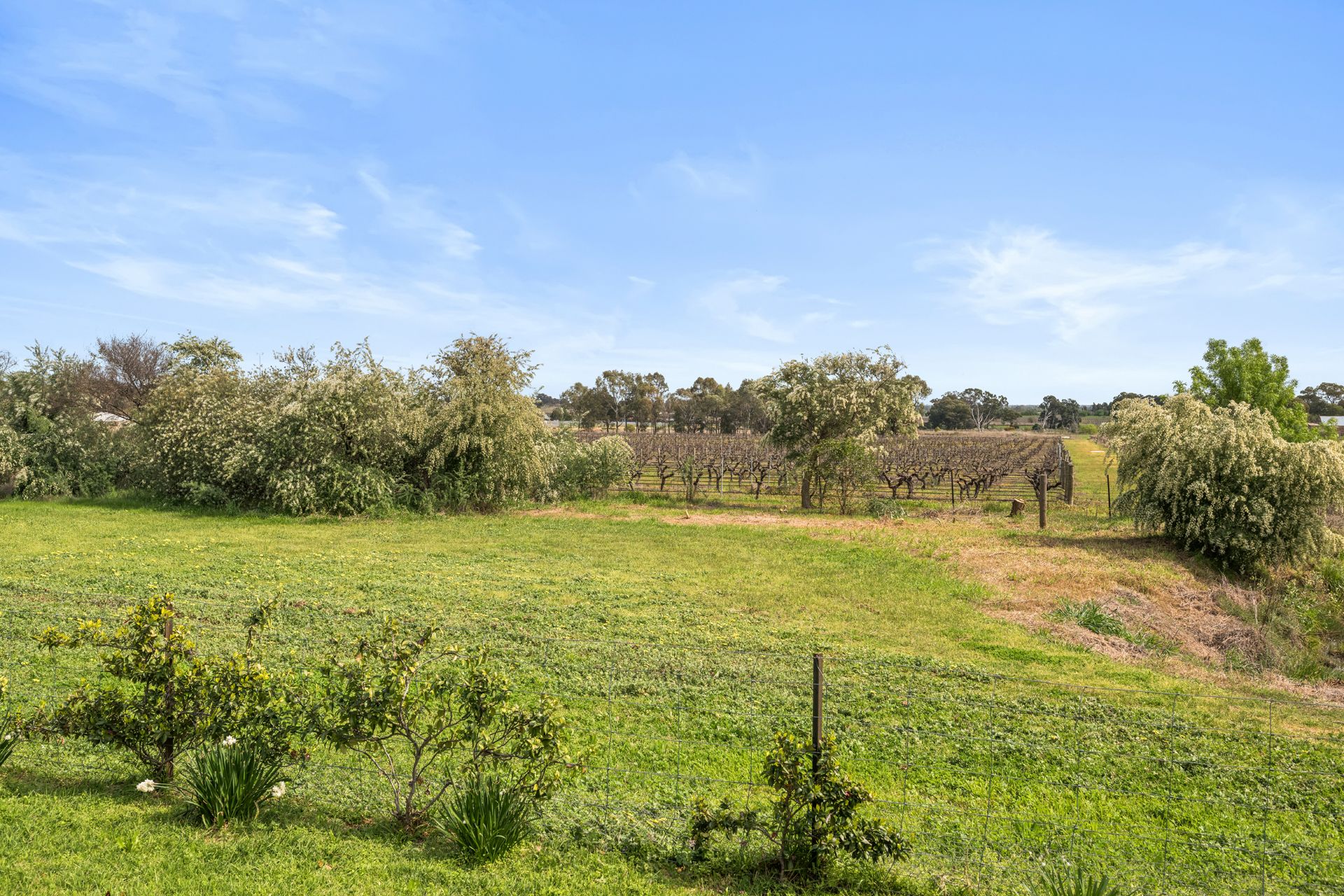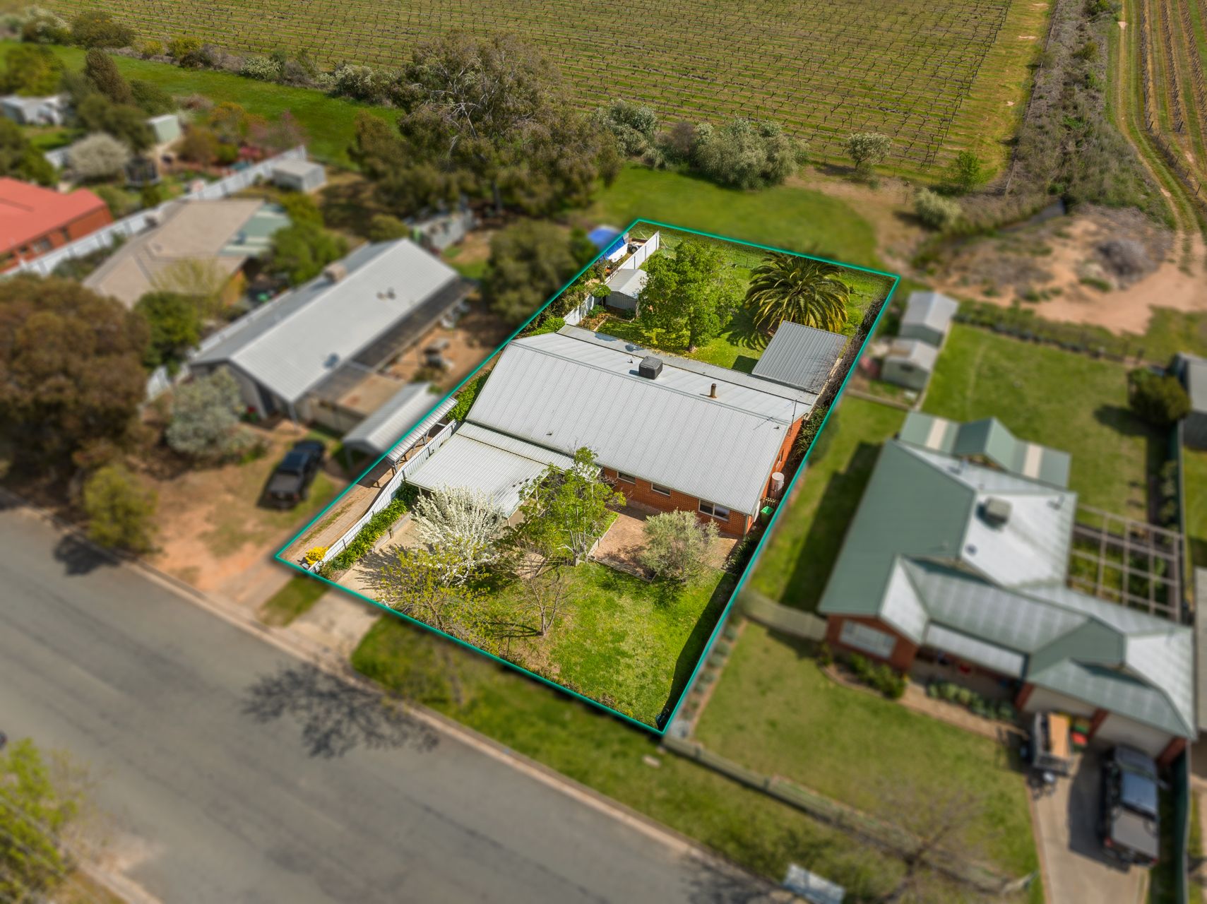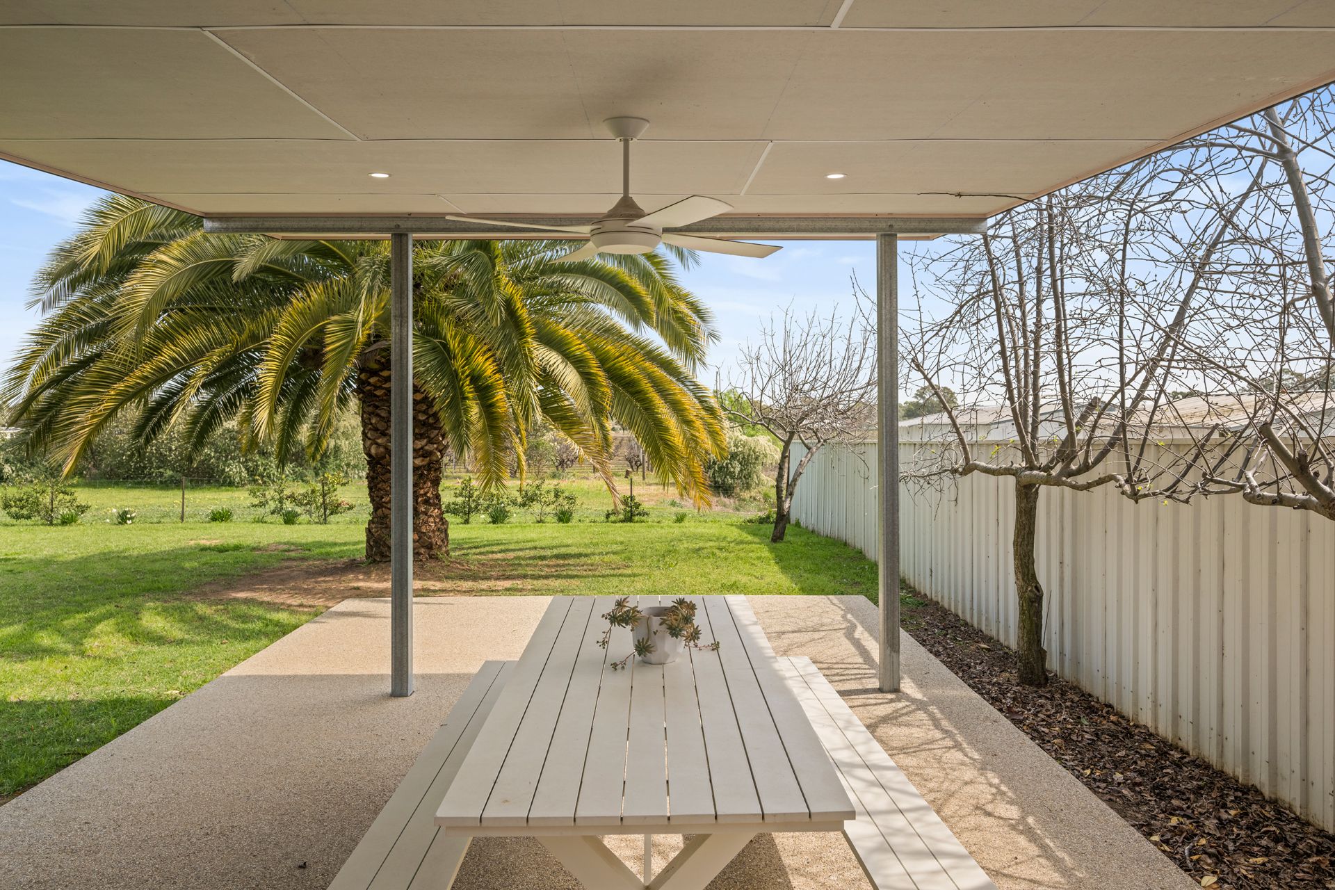 Stepping outside, you'll be captivated by the wonderful views across the neighboring vineyards. The wide back verandah leads to a fantastic undercover entertaining area, set on a concrete aggregate base and complete with LED lighting and a ceiling fan, making it perfect for outdoor gatherings. The low-maintenance garden features mature trees, neat lawn areas, and a handy garden shed. There is also rear lane access and evaporative cooling throughout.