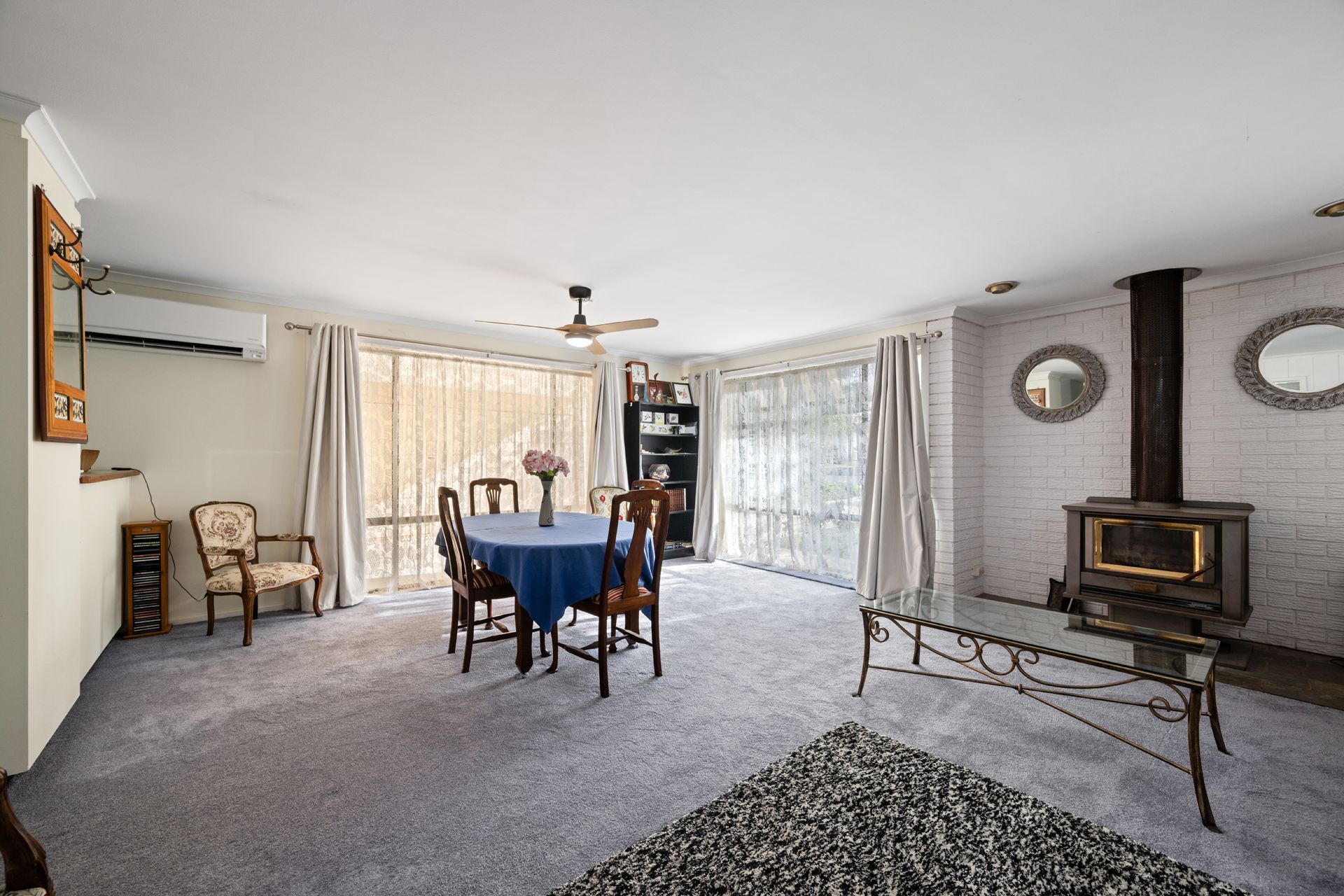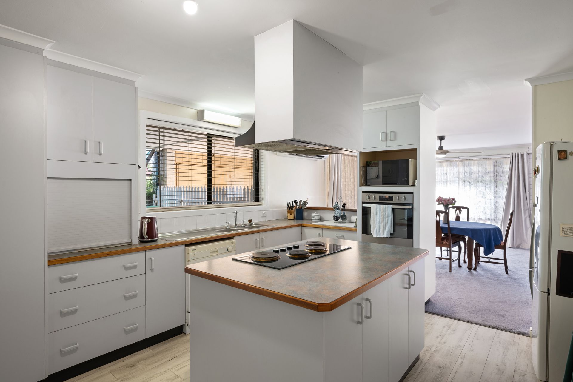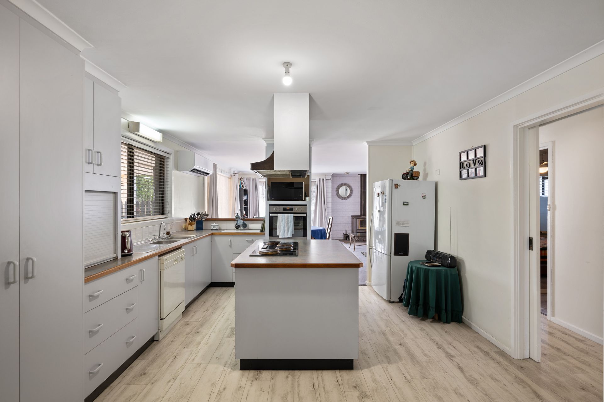 At the heart of the home is a bright open-plan living, dining and kitchen area, framed by large windows that flood the space with natural light. A wood heater fireplace, ceiling fans and a split system ensure comfort regardless of the season. The spacious kitchen is a standout, featuring an expansive island bench, abundant storage and bench space, plus a dedicated meals area. From here, sliding doors open onto a large covered patio, creating the perfect spot to enjoy your morning coffee or entertain guests while overlooking the lush fernery and backyard.